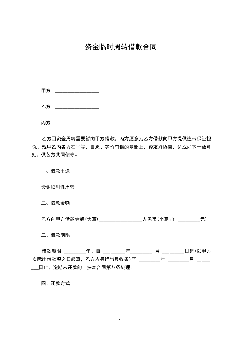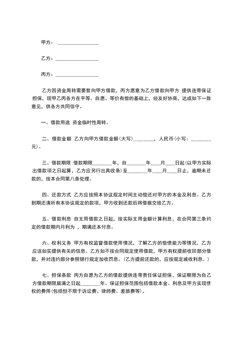 乙方因资金周转需要暂向甲方借款,丙方愿意为乙方借款向甲方提供连带保证担保,现甲乙丙各方在平等、自愿、等价有偿的基础上,经友好协商,达成如下一致意见,供各方共同信守。