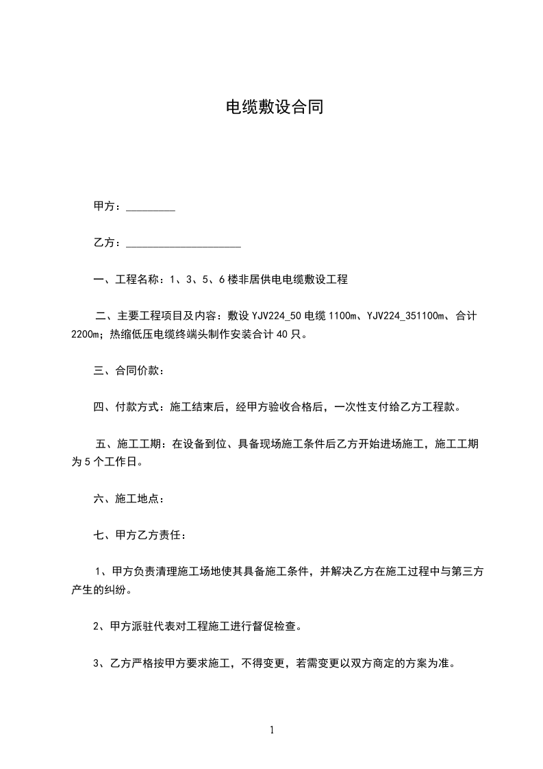 二、工程承包范围:320米电缆敷设(详见《安装工程预算书》)