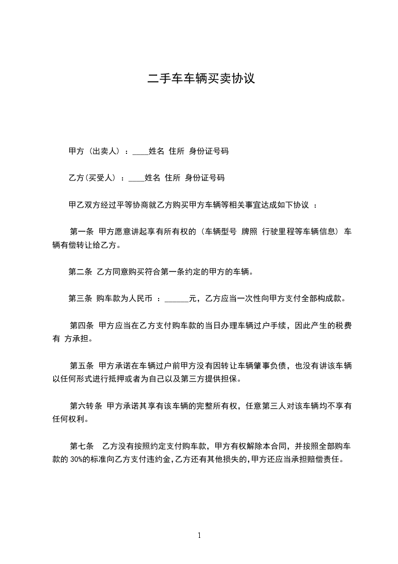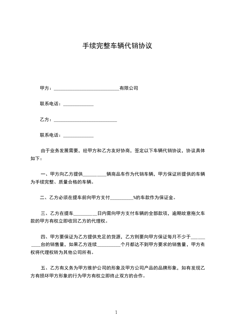 一、甲方向乙方提供__________辆商品车作为代销车辆,甲方保证所提供的车辆为手续完整、质量合格的车辆。