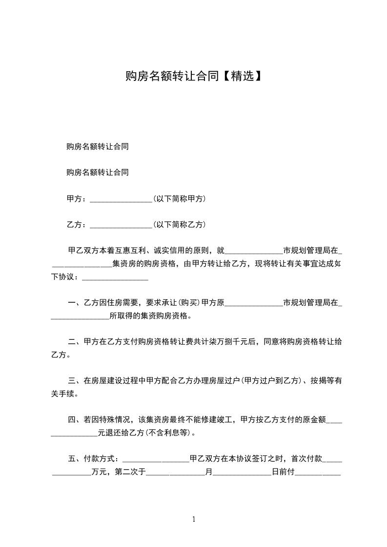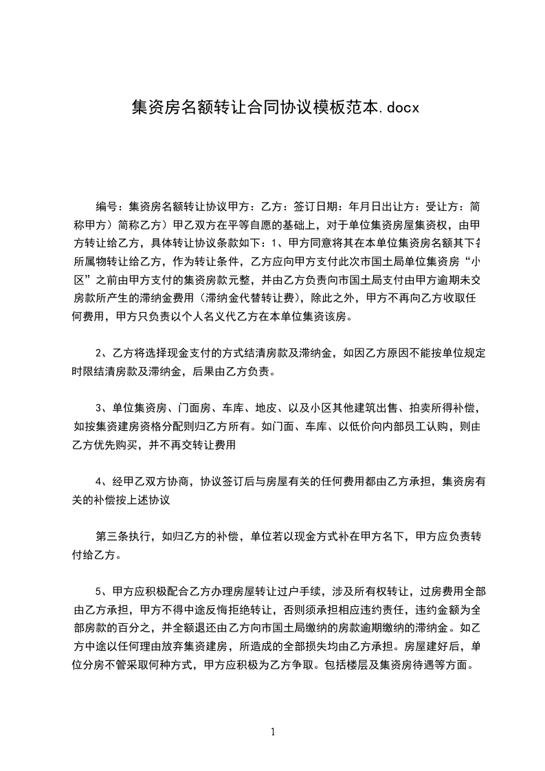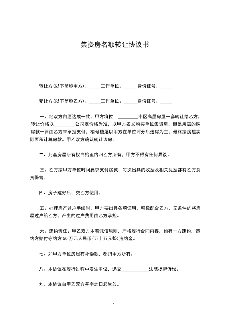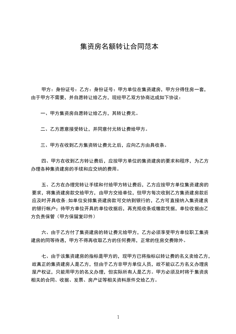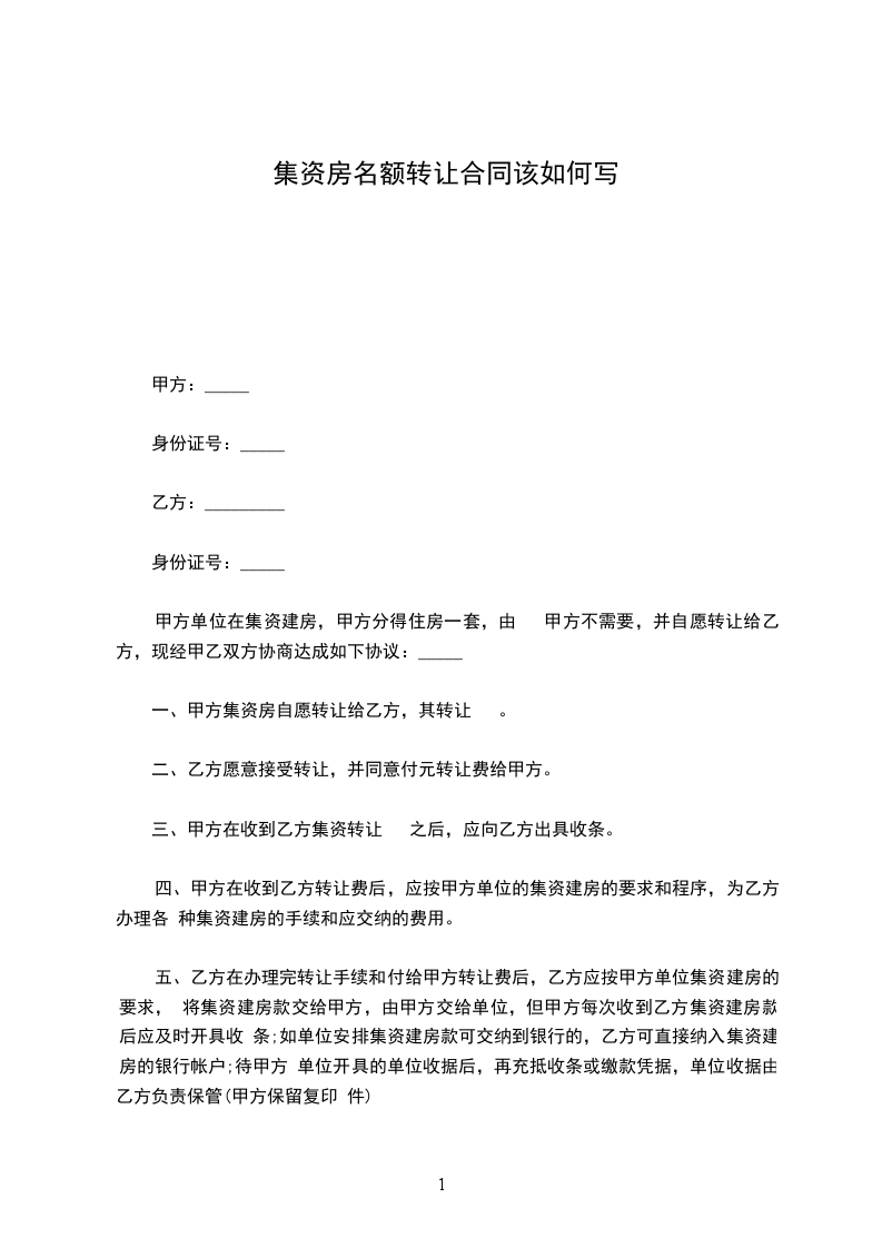 2、甲方同意将其在本单位的集资房名额转让给乙方,甲方只负责以个人名义代乙方在本单位集资该房。