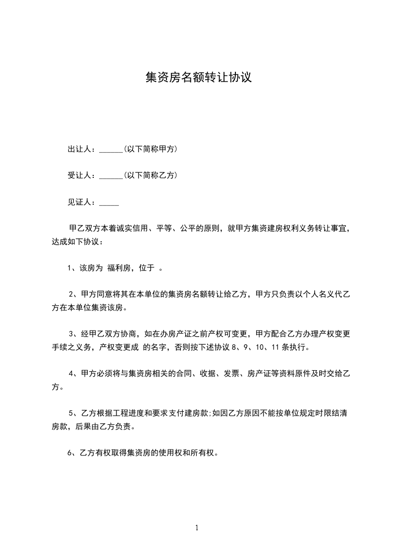 甲乙双方本着诚实信用、平等、公平的原则,就甲方集资建房权利义务转让事宜,达成如下协议:
