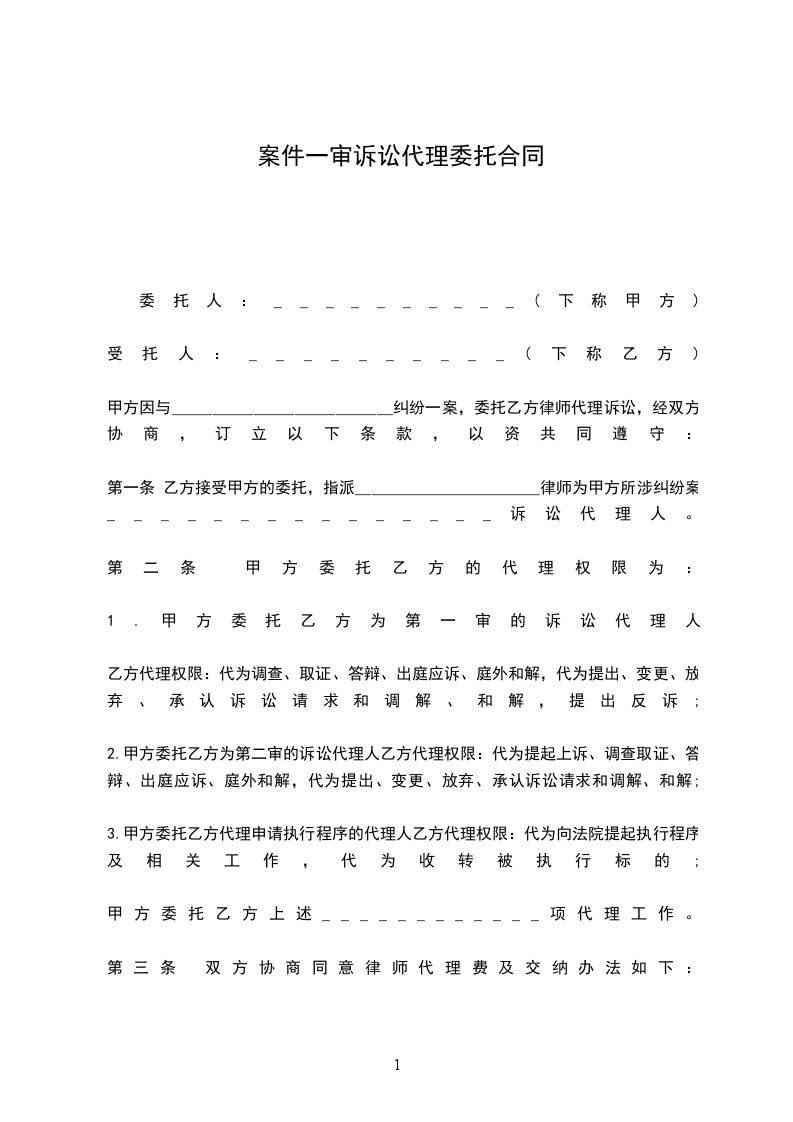 一、乙方接受甲方的委托,指派________、____ 律师为甲方与__________________________ 纠纷案的第________ 审代理人。