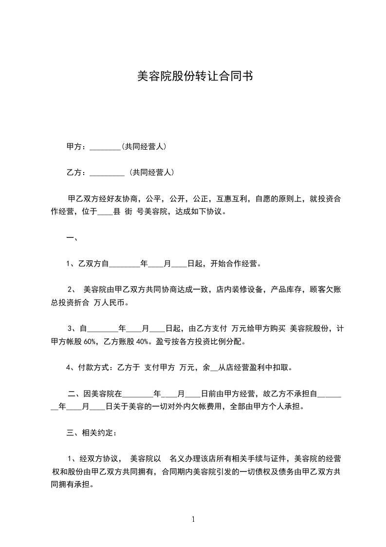 1、经双方协议, 美容院以 名义办理该店所有相关手续与证件,美容院的经营权和股份由甲乙双方共同拥有,合同期内美容院引发的一切债权及债务由甲乙双方共同拥有承担。