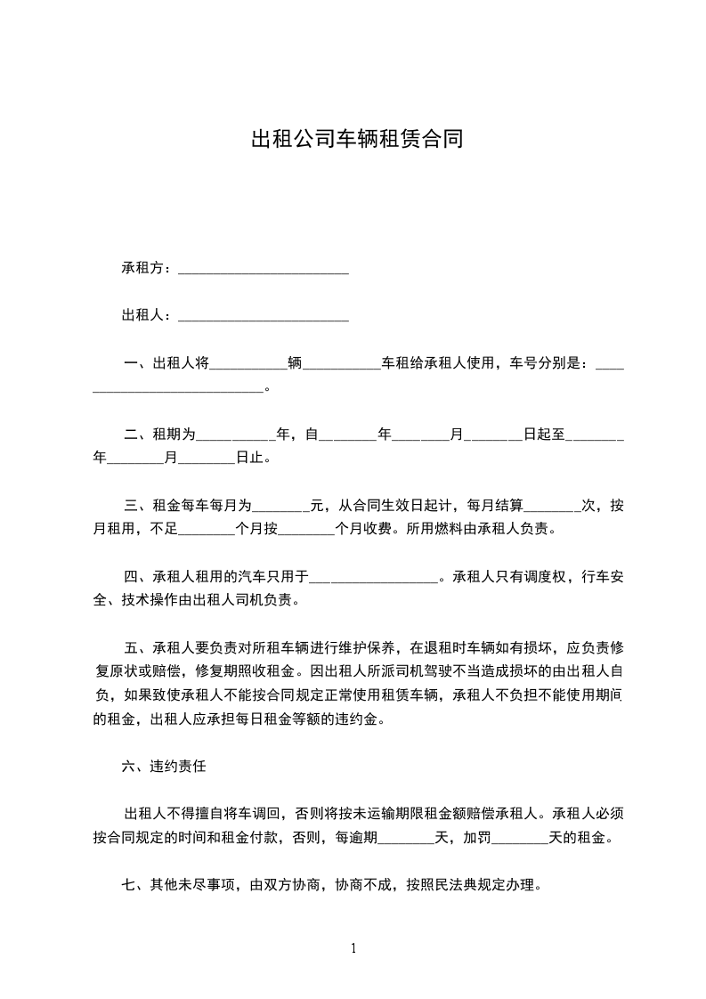 出租人不得擅自将车调回,否则将按未运输期限租金额赔偿承租人。承租人必须按合同规定的时间和租金付款,否则,每逾期________天,加罚________天的租金。