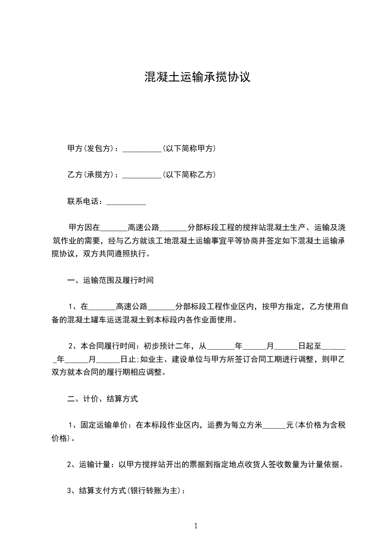 甲方因在_______高速公路_______分部标段工程的搅拌站混凝土生产、运输及浇筑作业的需要,经与乙方就该工地混凝土运输事宜平等协商并签定如下混凝土运输承揽协议,双方共同遵照执行。