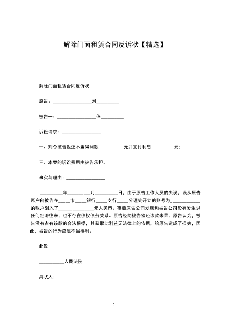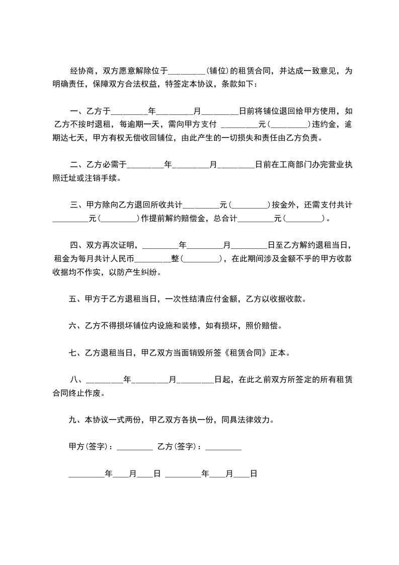 一、乙方于_________年_________月_________日前将铺位退回给甲方使用,如乙方不按时退租,每逾期一天,需向甲方支付 _________元(_________)违约金,逾期达七天,甲方有权无偿收回铺位,由此产生的一切损失和责任由乙方负责。