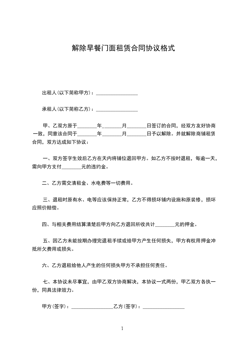 经协商,双方愿意解除位于_________(铺位)的租赁合同,并达成一致意见,为明确责任,保障双方合法权益,特签定本协议,条款如下: