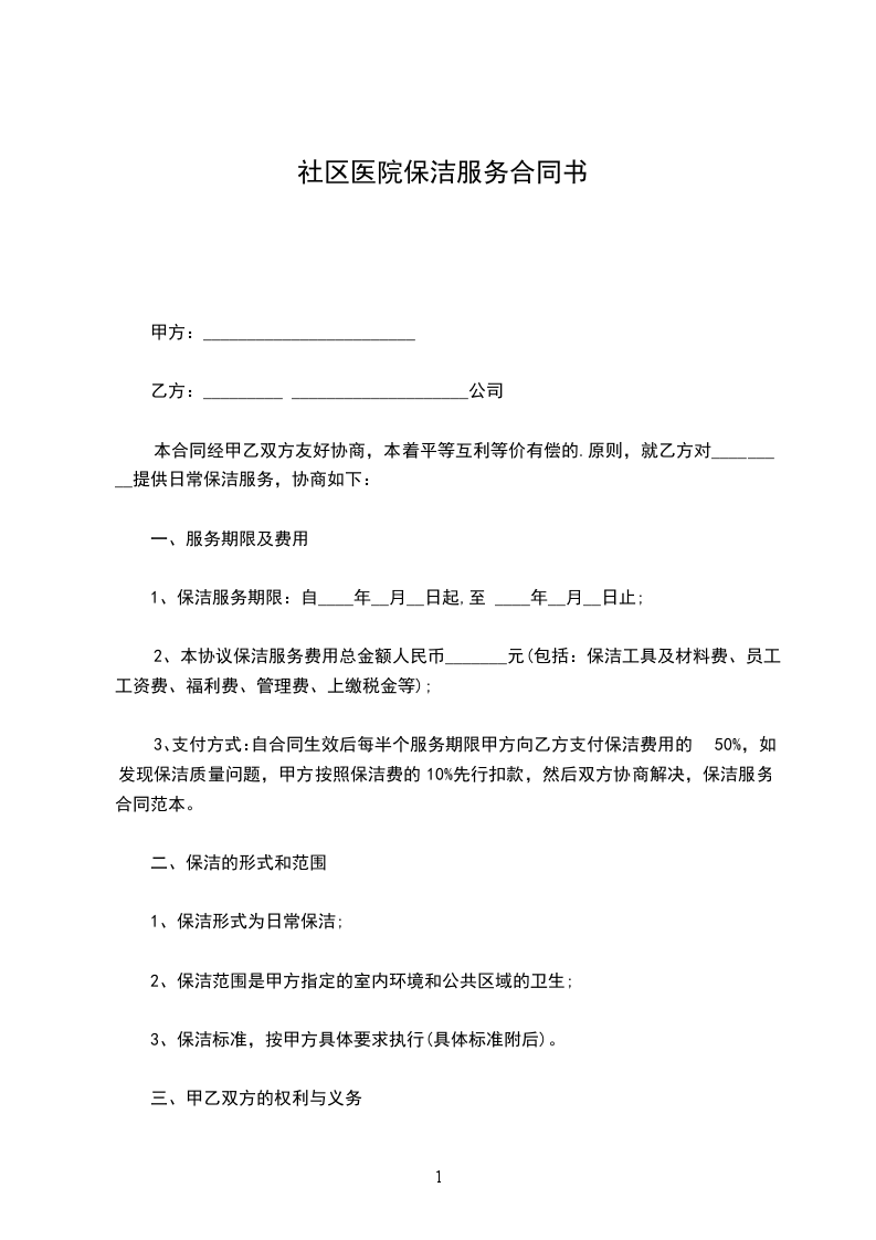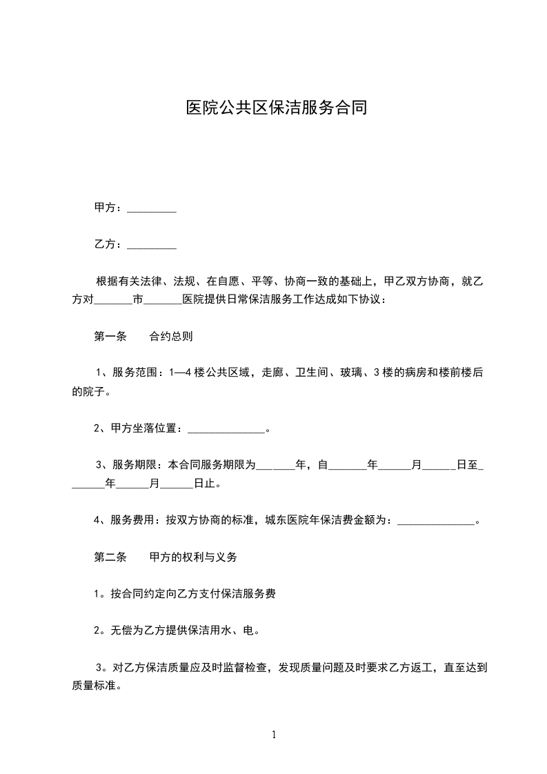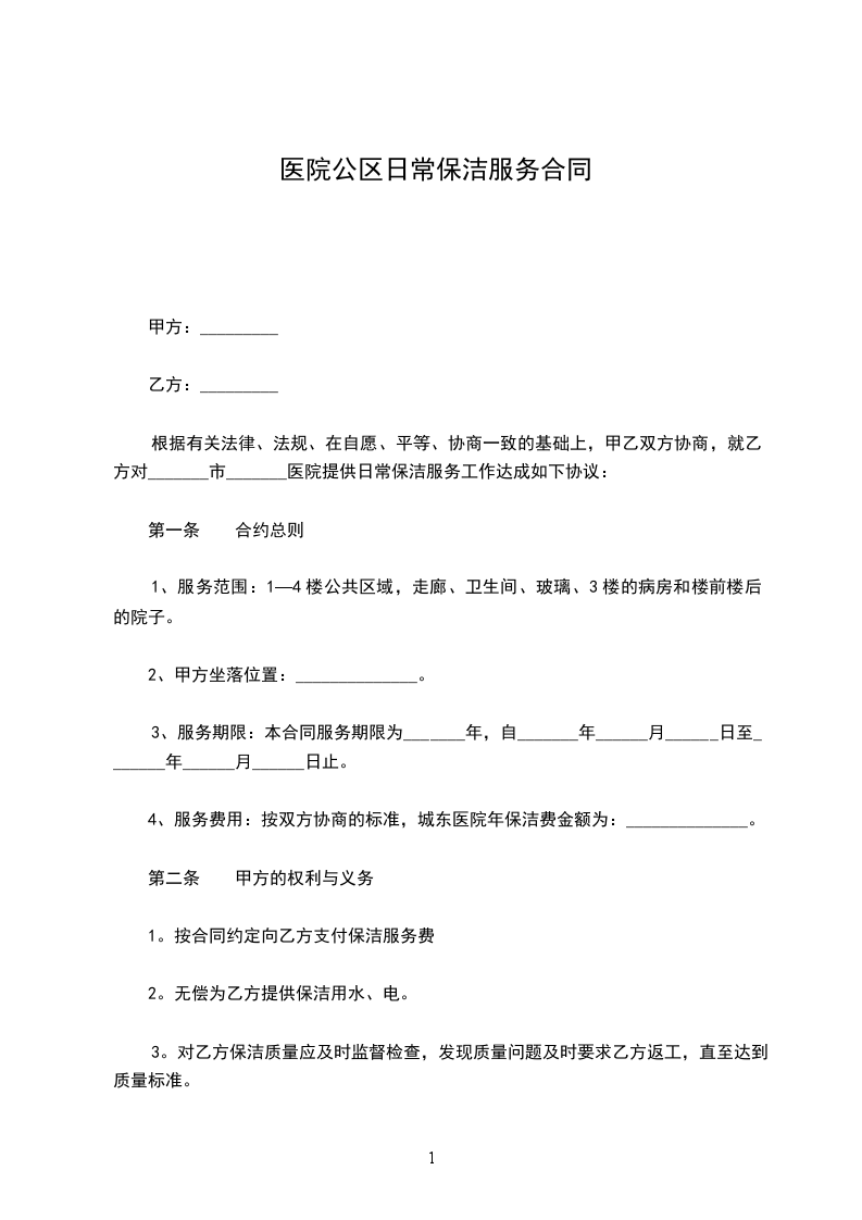 根据有关法律、法规、在自愿、平等、协商一致的基础上,甲乙双方协商,就乙方对_______市_______医院提供日常保洁服务工作达成如下协议: