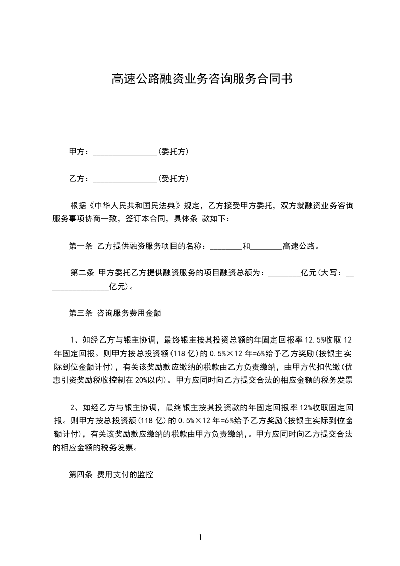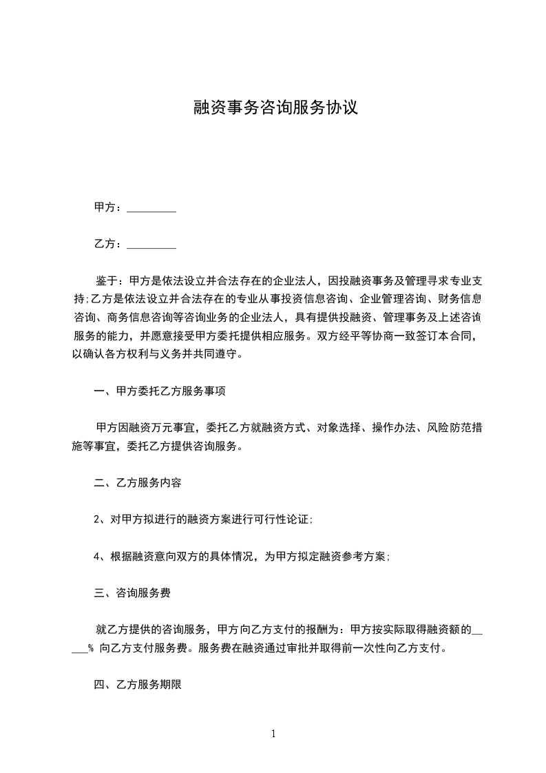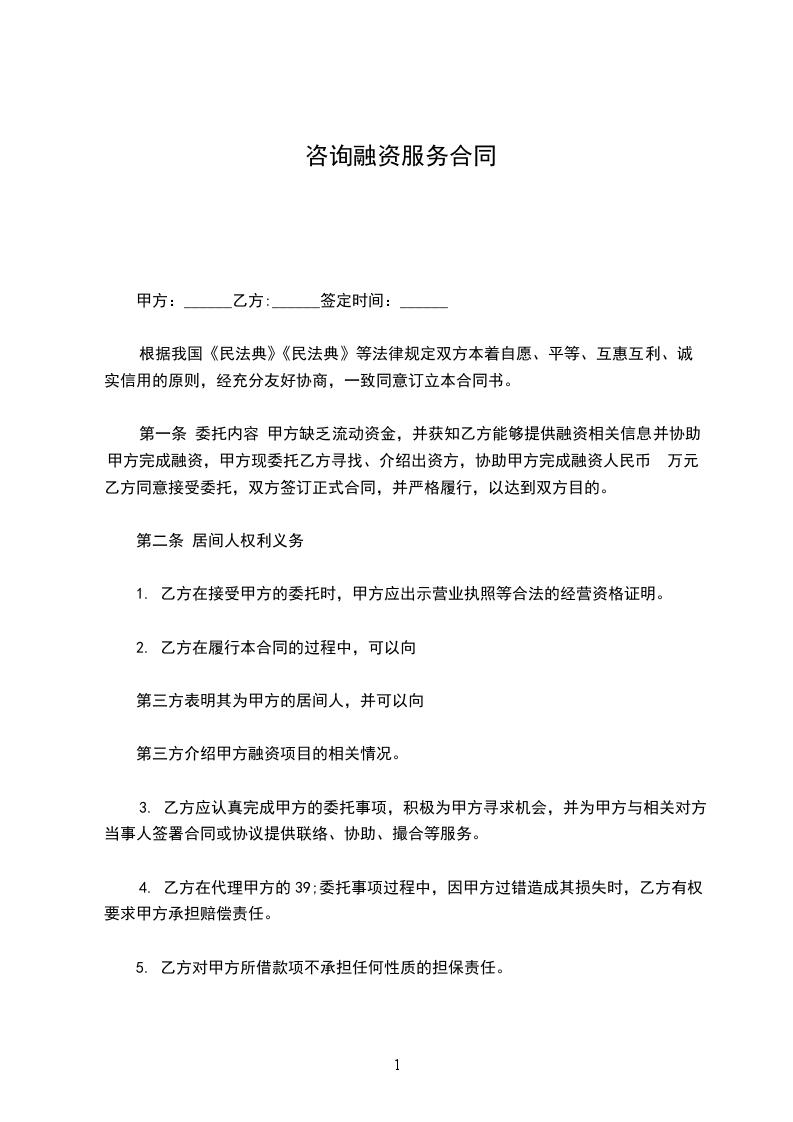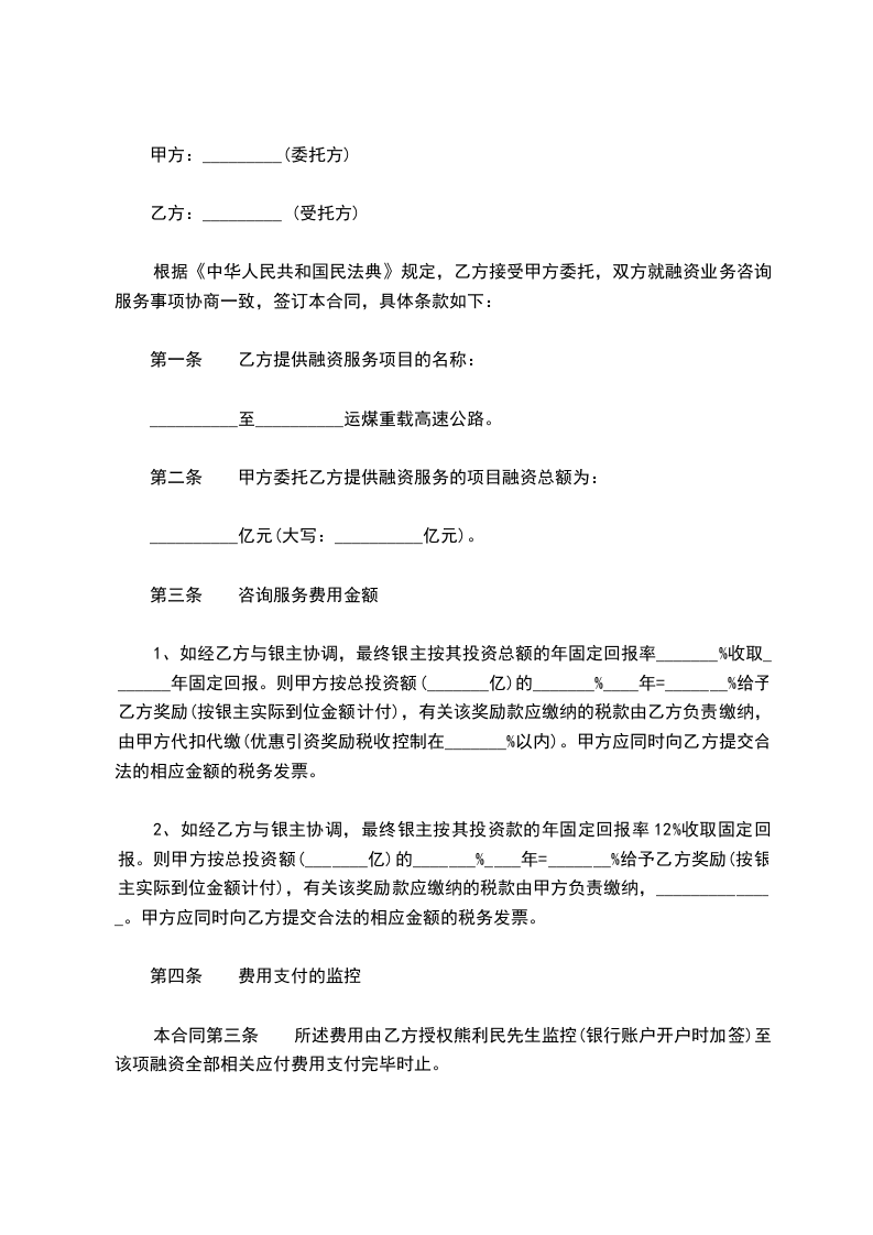 根据《中华人民共和国民法典》规定,乙方接受甲方委托,双方就融资业务咨询服务事项协商一致,签订本合同,具体条款如下: