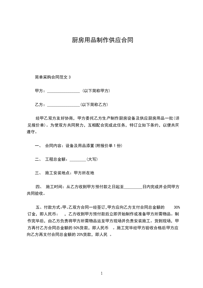经甲乙双方友好协商,甲方委托乙方生产制作厨房设备及供应厨房用品一批(详见报价单)。为使双方共同努力,互相配合完成此任务,特订立如下条约,以便共同遵守。
