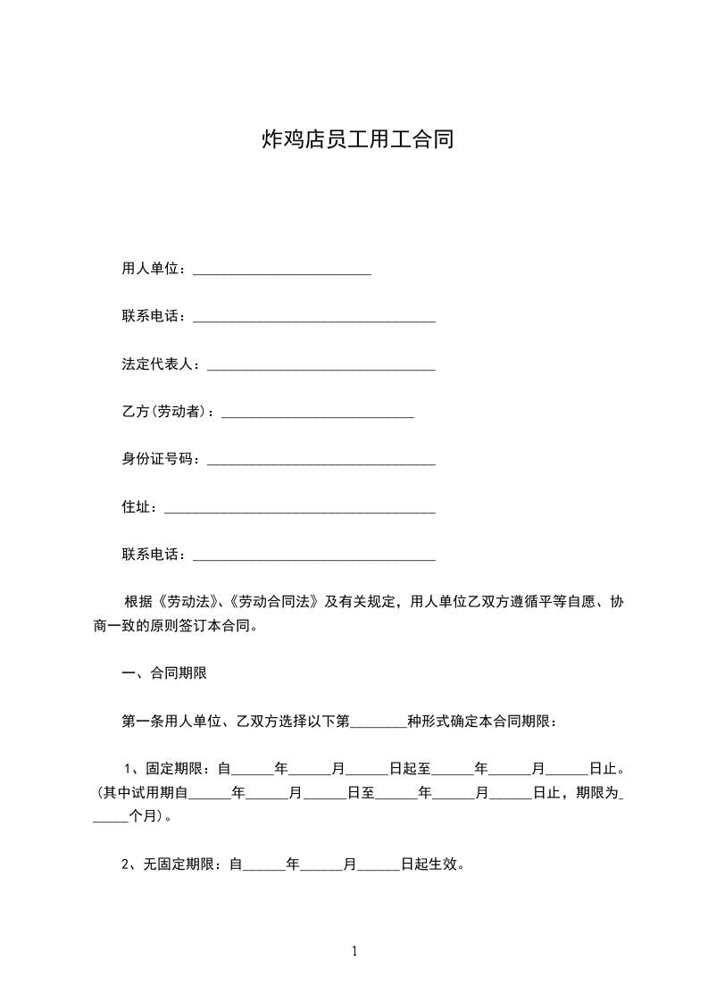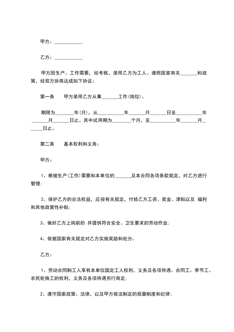 第一条 甲方录用乙方从事_______工作(岗位)。