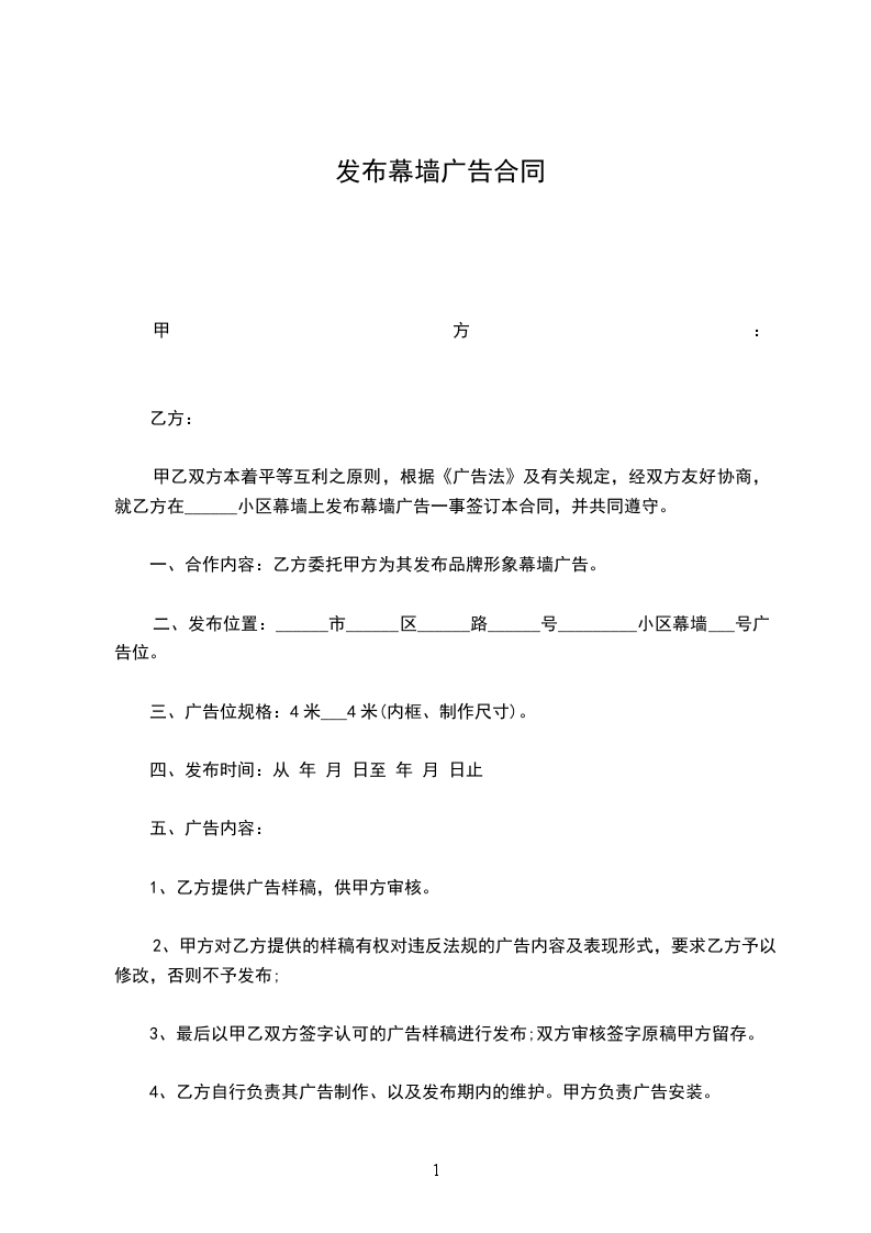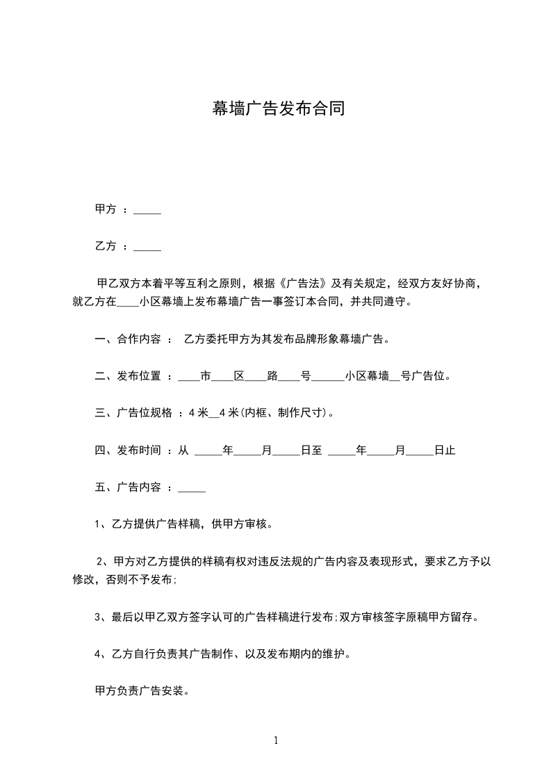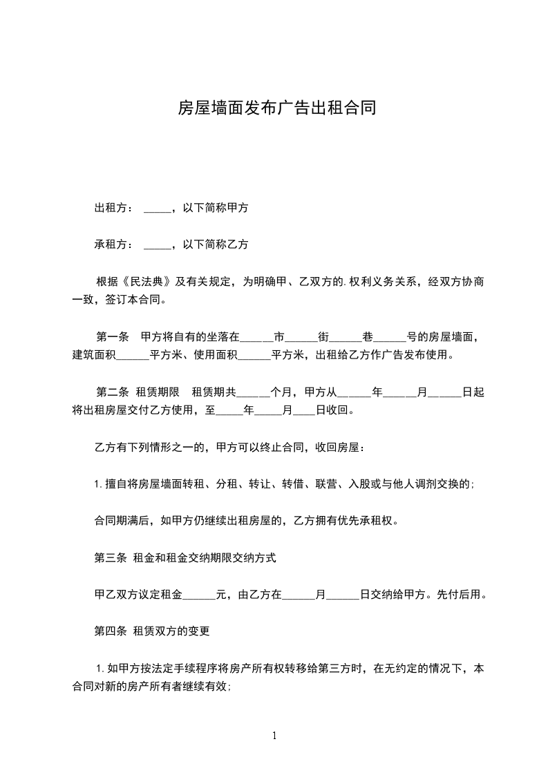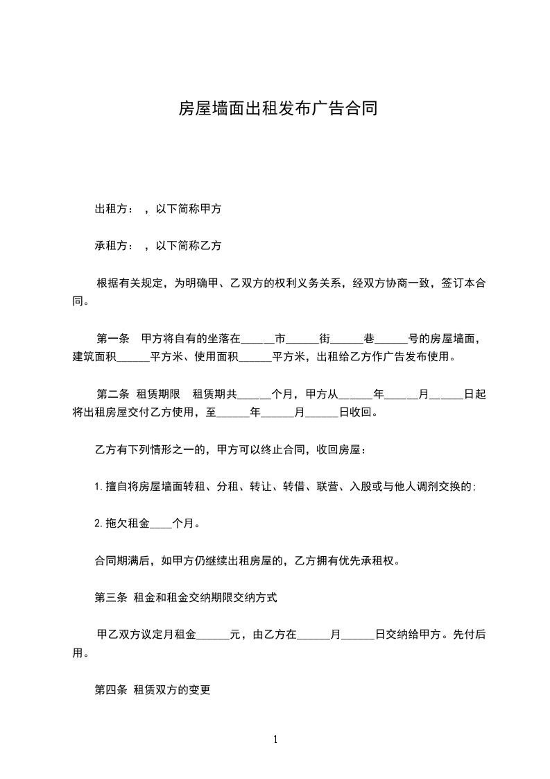 第一条 甲方将自有的坐落在________市________街________巷________号的房屋墙面,建筑面积_______________平方米、使用面积_______________平方米,出租给乙方作广告发布使用。