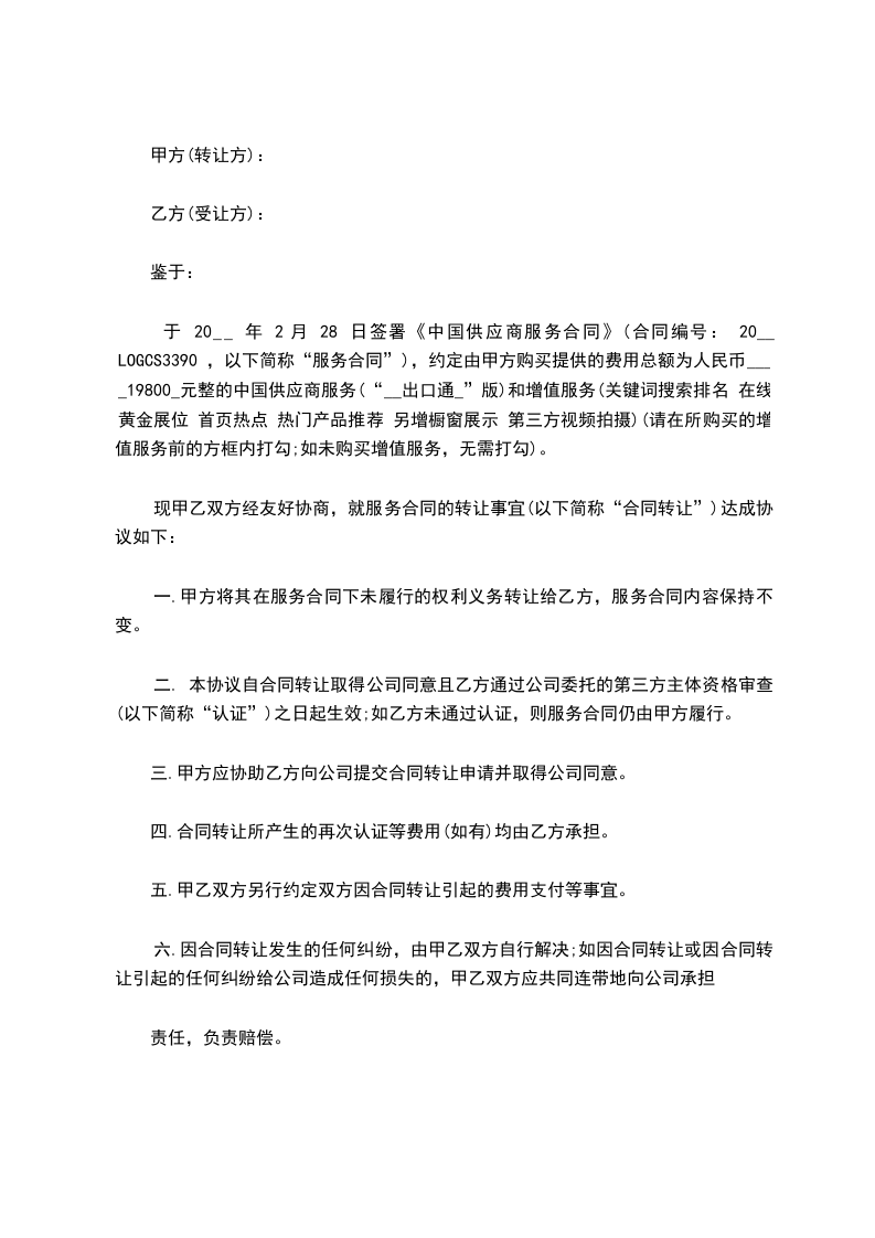 于 20__ 年 2月 28 日签署《中国供应商服务合同》(合同编号: 20__LOGCS3390 ,以下简称“服务合同”),约定由甲方购买提供的费用总额为人民币____19800_元整的中国供应商服务(“__出口通_”版)和增值服务(关键词搜索排名 在线黄金展位 首页热点 热门产品推荐 另增橱窗展示 第三方视频拍摄)(请在所购买的增值服务前的方框内打勾;如未购买增值服务,无需打勾)。