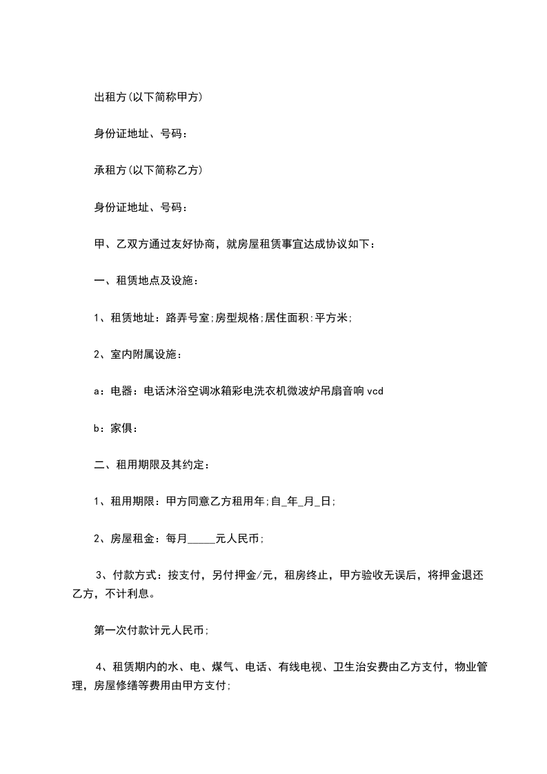 五、房屋租赁押金_____元(大写),待房屋租赁协议解除后,全部或部分返还乙方。拖欠水费、电费和未按时提前通知甲方单方面解除租赁协议的房屋闲置的租金损失,将由押金支付。如押金被扣除,乙方须在3天内补齐押金,否则此房屋租赁协议自行终止。
