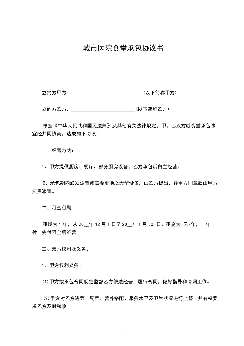 根据《中华人民共和国民法典》及其他有关法律规定,甲、乙双方就食堂承包事宜经共同协商,达成如下协议: