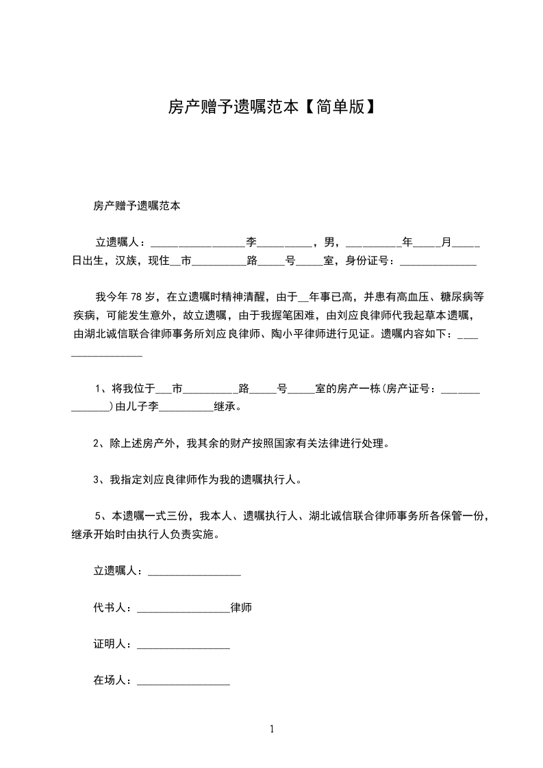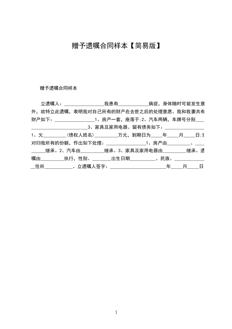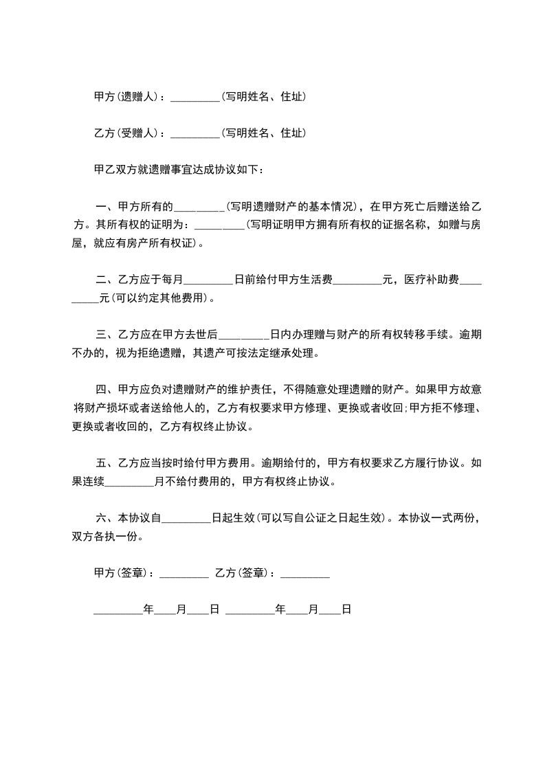 一、甲方所有的_________(写明遗赠财产的基本情况),在甲方死亡后赠送给乙方。其所有权的证明为:_________(写明证明甲方拥有所有权的证据名称,如赠与房屋,就应有房产所有权证)。