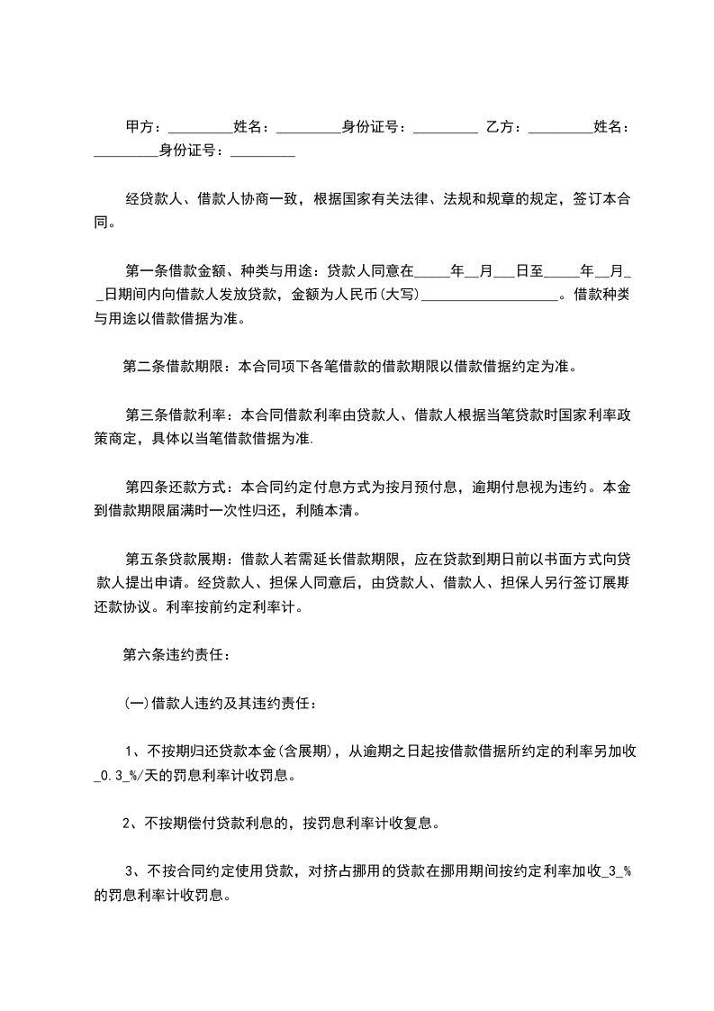 第一条借款金额、种类与用途:贷款人同意在_____年__月___日至_____年__月__日期间内向借款人发放贷款,金额为人民币(大写)___________________。借款种类与用途以借款借据为准。