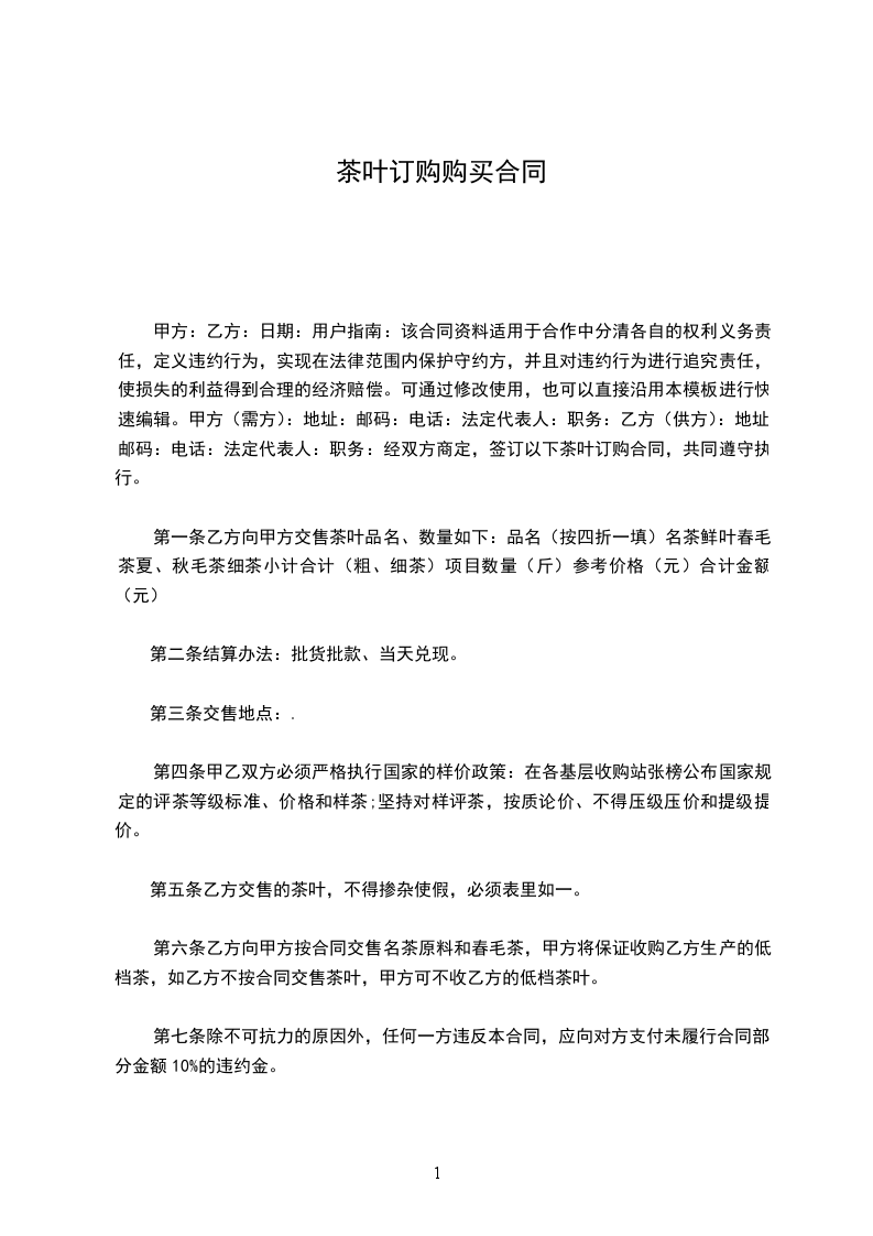 第五条 乙方交售的茶叶,不得掺杂使假,必须表里如一。