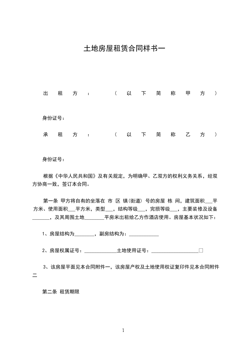 第一条 甲方将自有的坐落在 市 区 镇(街道) 号的房屋 栋 间,建筑面积___平方米、使用面积___平方米,类型___,结构等级___,完损等级___,主要装修及设备_______,及其周围土地________平房米出租给乙方作酒店使用。房屋基本状况如下: