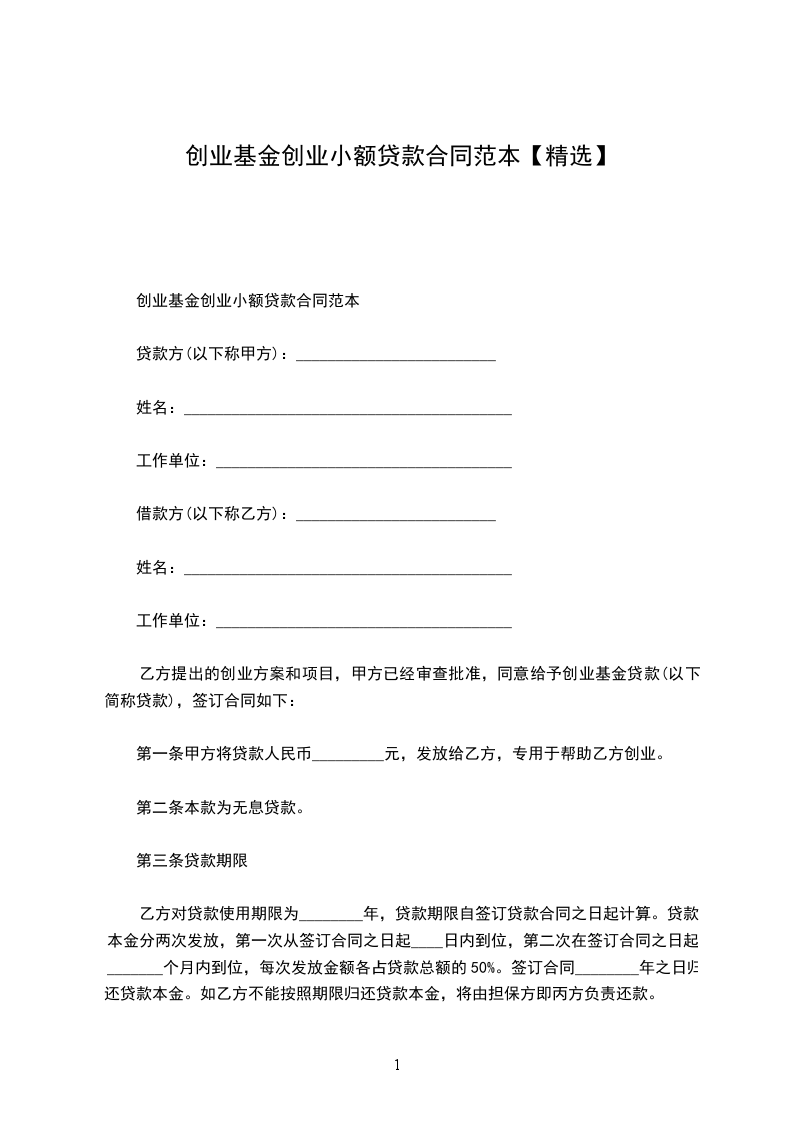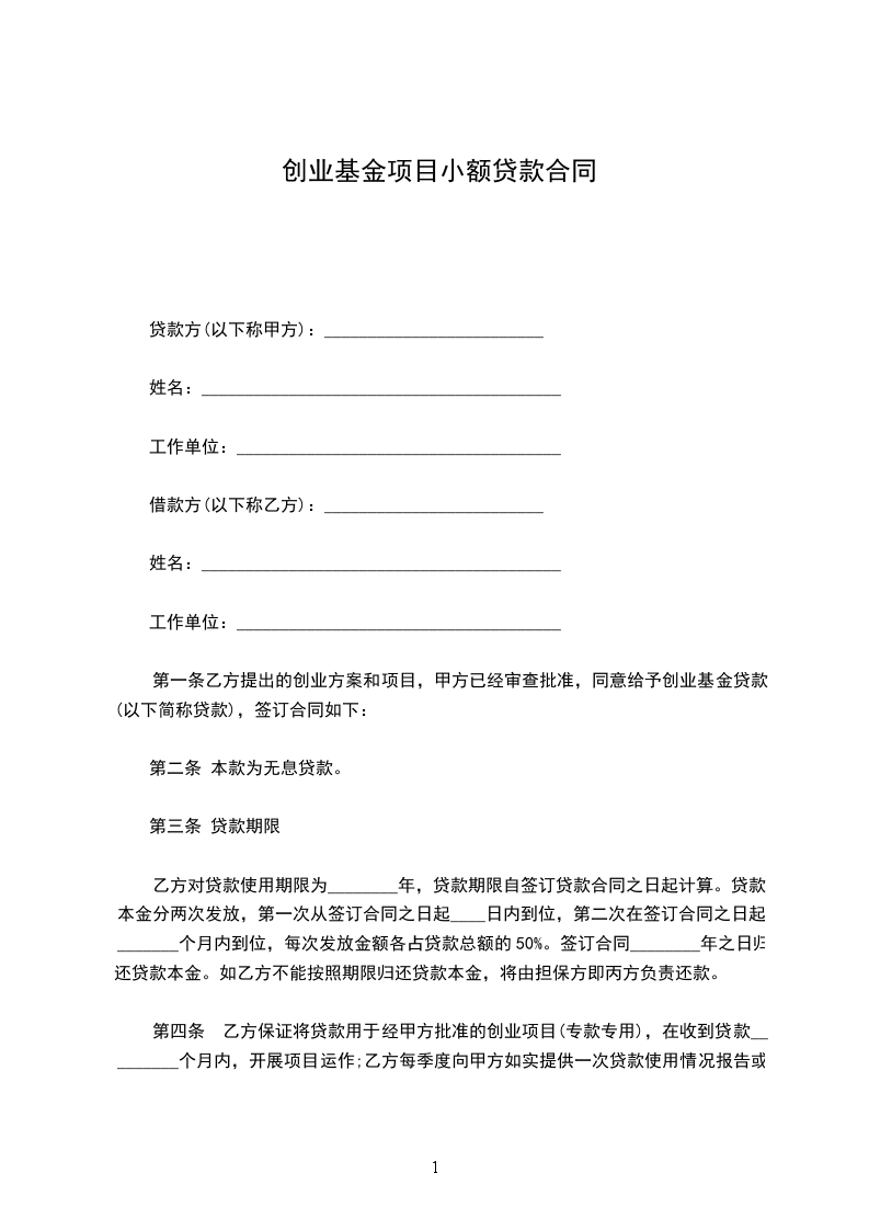 第一条 甲方将贷款人民币_________元,发放给乙方,专用于帮助乙方创业。