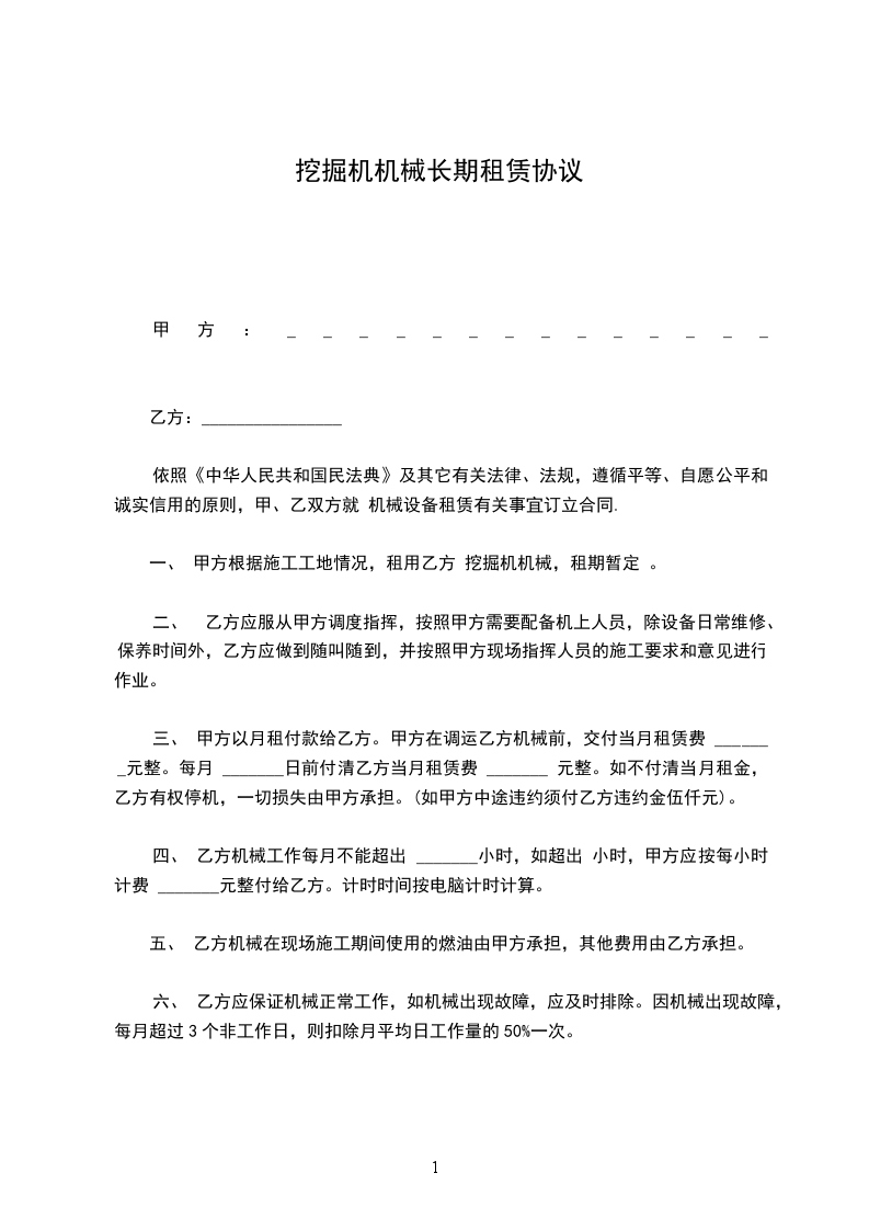 六、 乙方应保证机械正常工作,如机械出现故障,应及时排除。因机械出现故障,每月超过3个非工作日,则扣除月平均日工作量的50%一次。