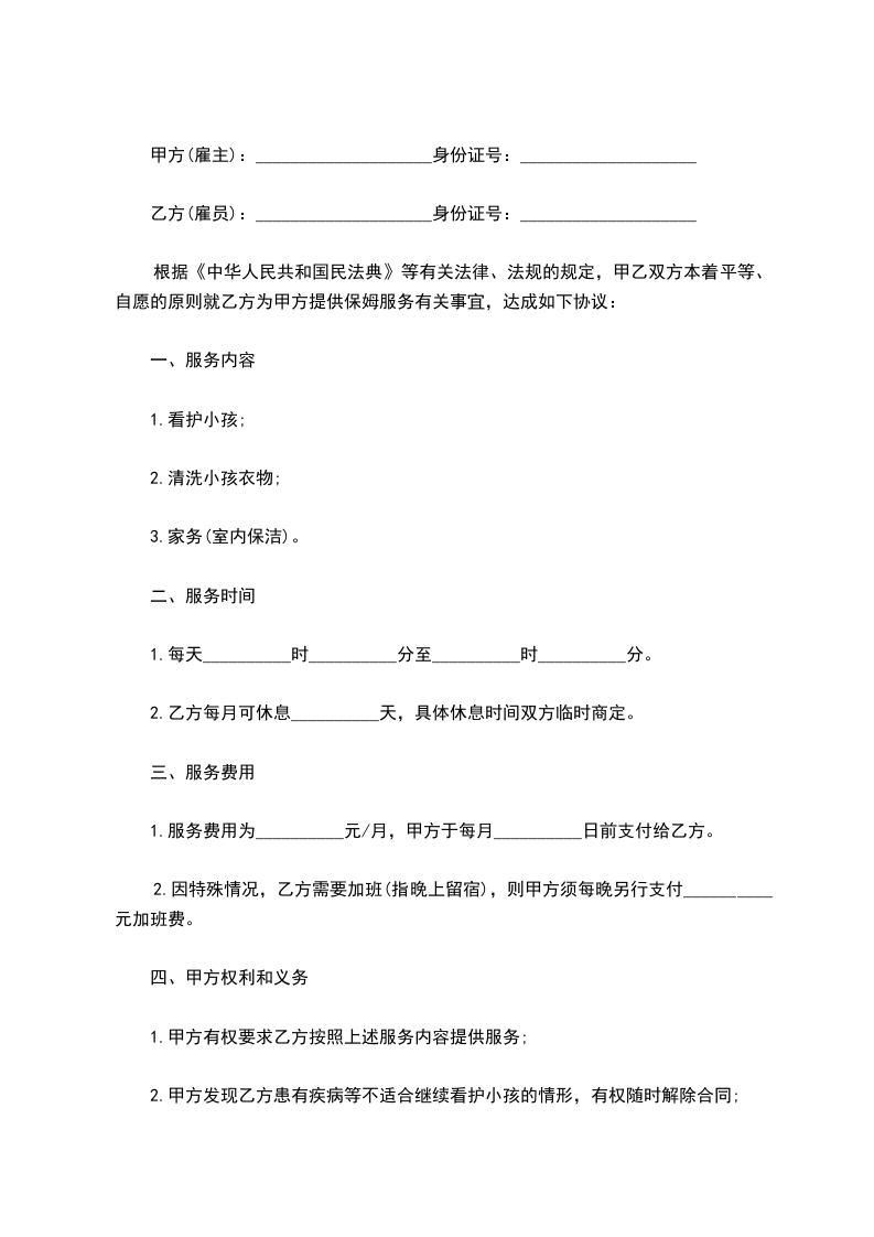 根据公平、公正、平等、自愿的原则,就甲方聘用乙方(保姆)工作达成如下协议:
