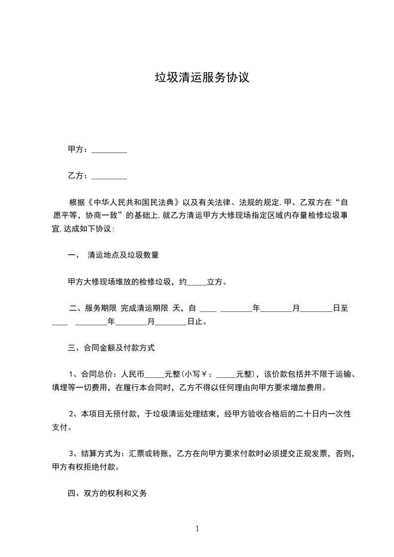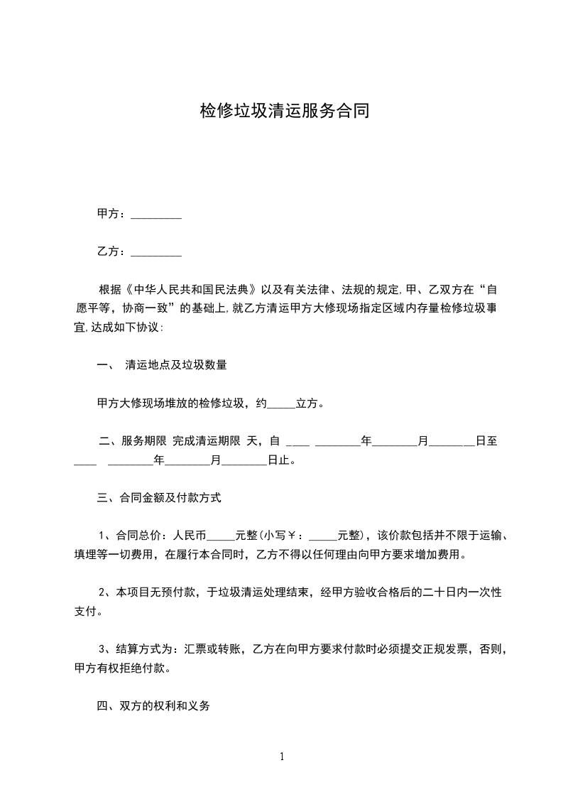 根据《中华人民共和国民法典》以及有关法律、法规的规定,甲、乙双方在“自愿平等,协商一致”的基础上,就乙方清运甲方大修现场指定区域内存量检修垃圾事宜,达成如下协议: