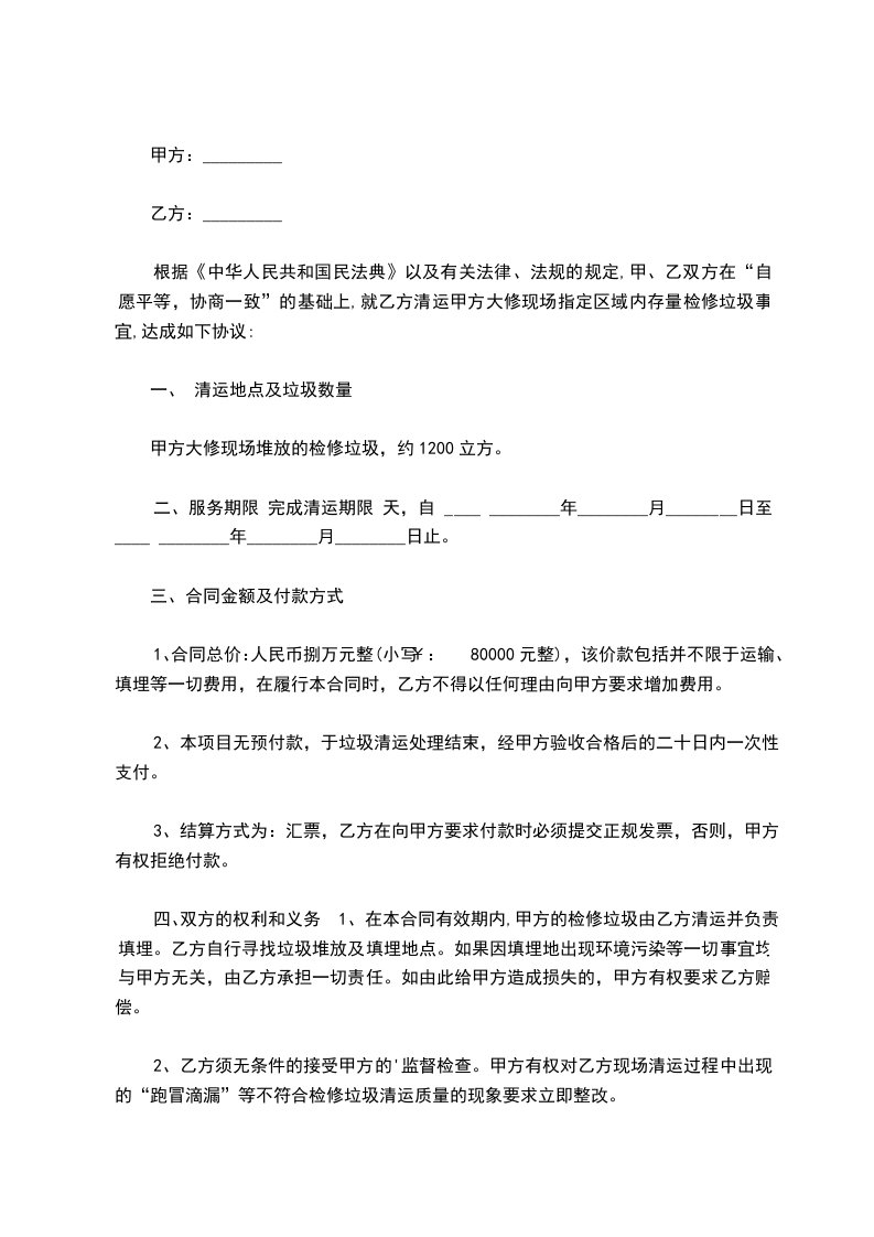 5、乙方须按本合同要求,保质保量完成检修垃圾清运工作,应做到工完料净场地清。