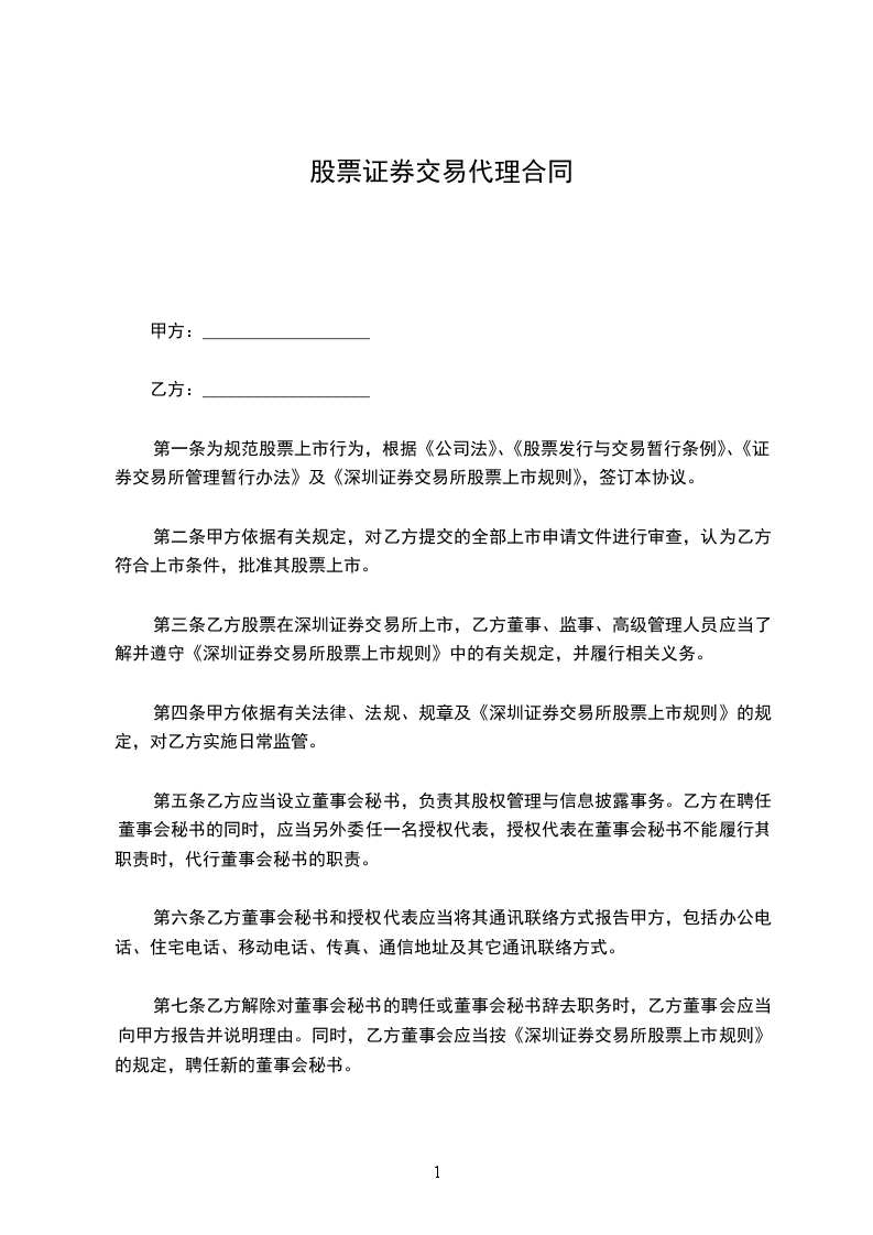 依照《中华人民共和国证券法》、《中华人民共和国民法典》、《证券公司代理股份转让服务业务试点办法》(以下简称《试点办法》)和其他有关法律、法规、规章制度,甲乙双方经友好协商,就甲方委托乙方代理股份转让及其他相关业务,共同达成如下协议: