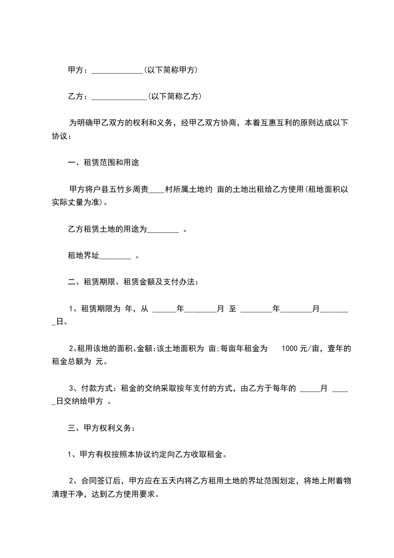 2、租用该地的面积、金额:该土地面积为 亩;每亩年租金为1000元/亩,壹年的租金总额为 元。