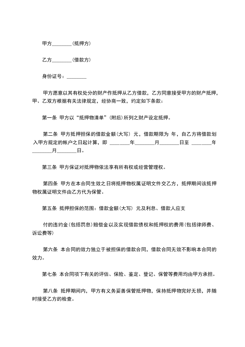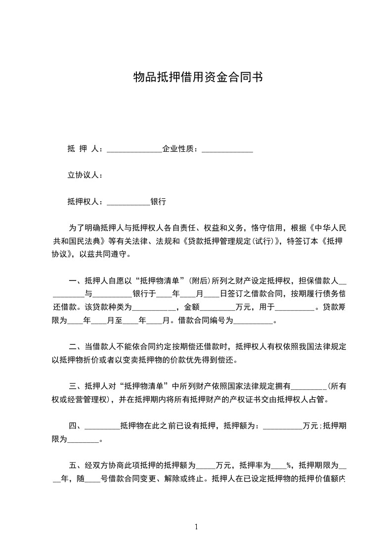 一、抵押人自愿以“抵押物清单”(附后)所列之财产设定抵押权,担保借款人__________与__________银行于____年____月____日签订之借款合同,按期履行债务偿还借款。该贷款种类为___________,金额_________万元,用于__________。贷款期限为____年____月至____年____月。借款合同编号为__________。