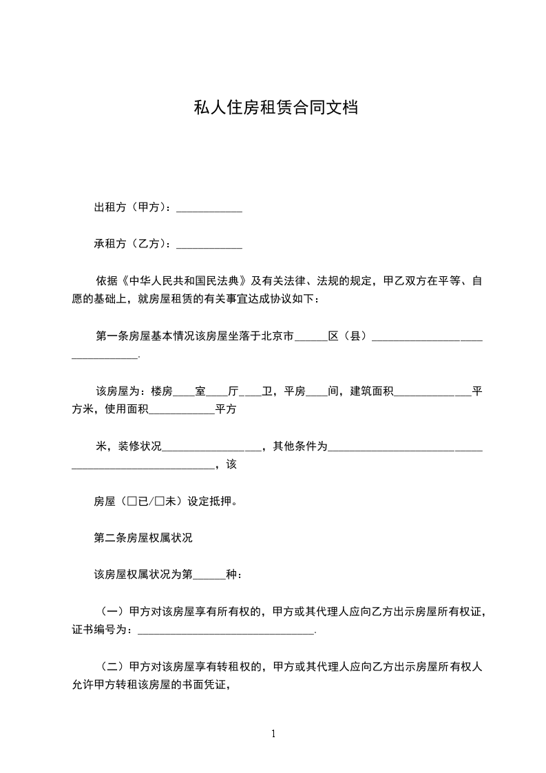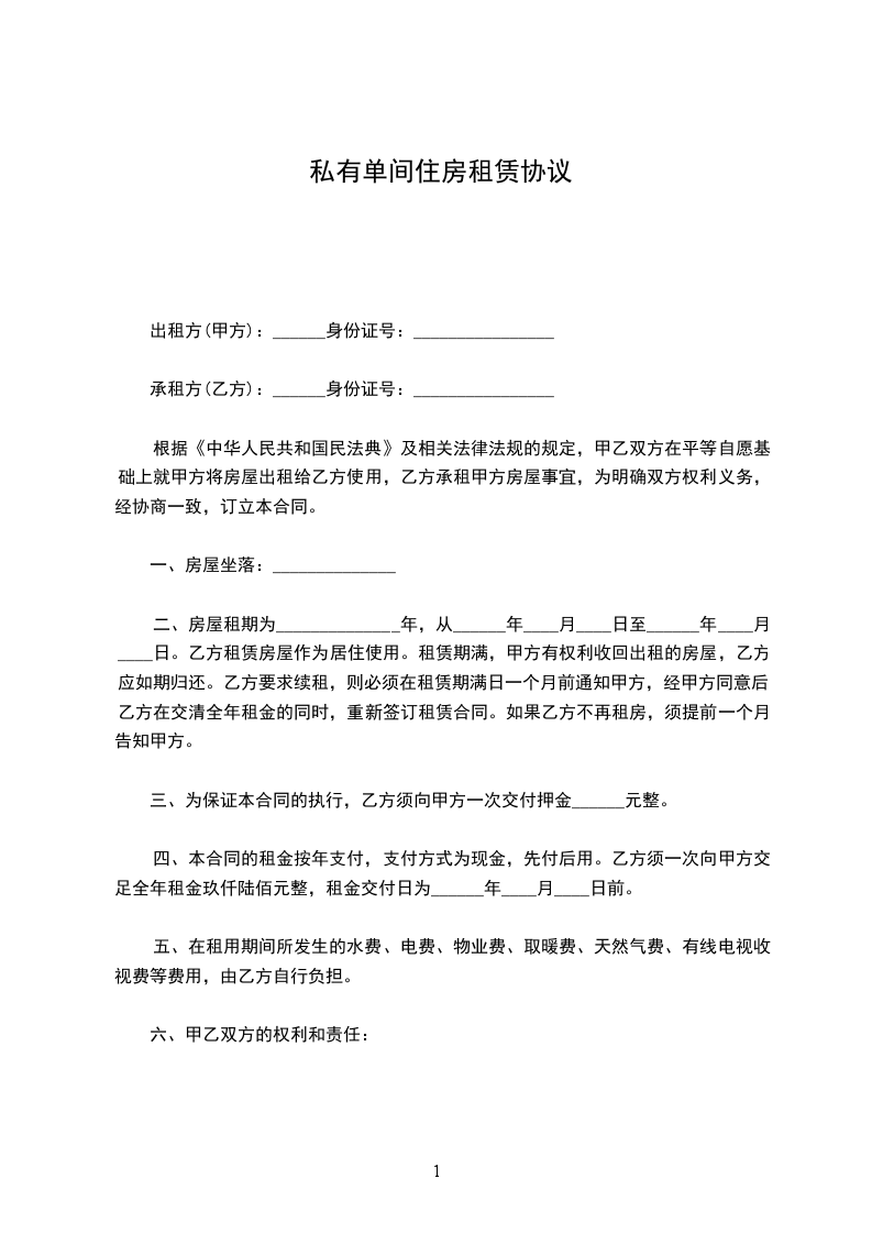 根据《民法典》及《民法典》的相关规定,本着公平、自愿的原则,经甲乙双方协商一致后签订本合同。 一、甲方出租房屋: 间(住房 间、厨房 间)。