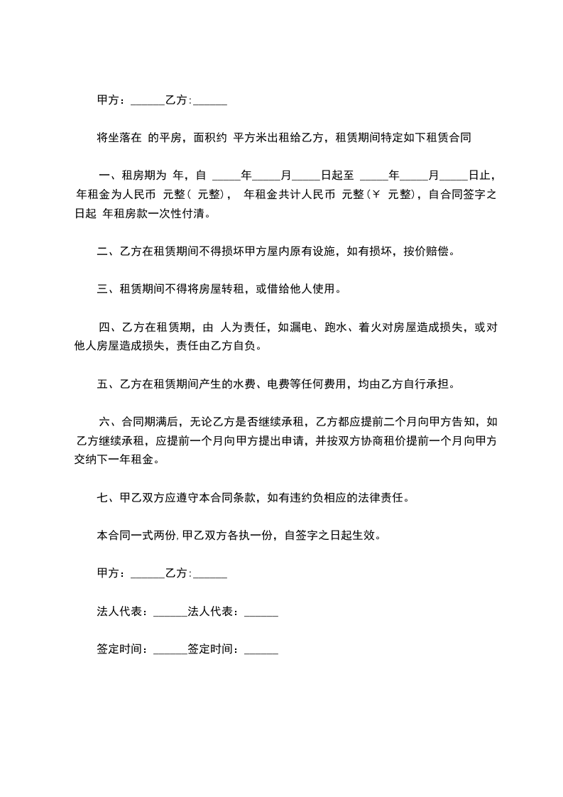3、如因自然灾害等不可抗因素致使乙方财产受到损失、人身健康受到伤害或死亡,甲方无需承担任何责任。 七、违约责任如乙方出现违反本合同条款的行为,视为违约。乙方违约后甲方可以单方面无条件解除合同,乙方必须承担恢复承租房屋原状、赔偿损失、恢复名誉等相关责任,并额外支付甲方违约金伍仟元。