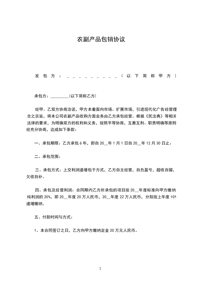经甲、乙双方协商洽谈,甲方本着面向市场、扩展市场,引进现代化广告经营理念之宗旨,将本公司农副产品收购方面业务由乙方承包经营。根据《民法典》等相关法律的要求,为明确双方的权利和义务,按照平等协商,互惠互利、职责明确等原则,经充分协商,达成如下条款: