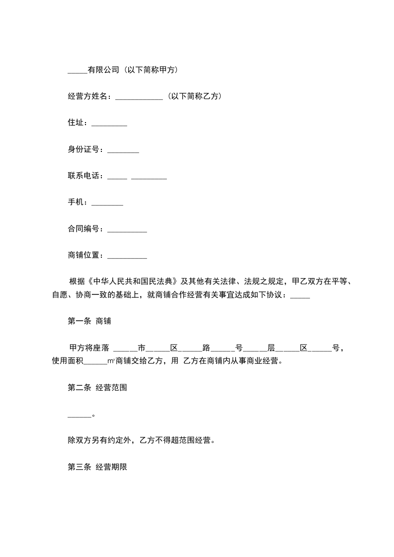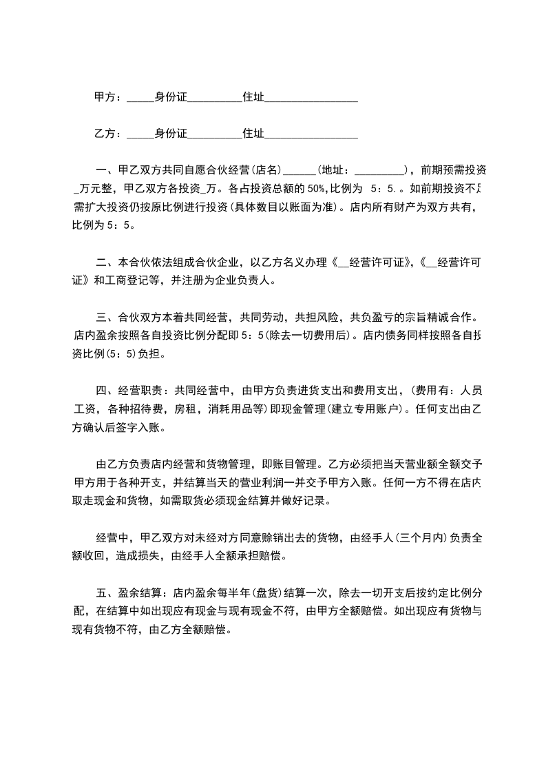 甲、乙双方本着平等、诚实、互利共羸,团结合作的精神,经友好协商,共同经营______ 的事宜达成如下合伙协议: