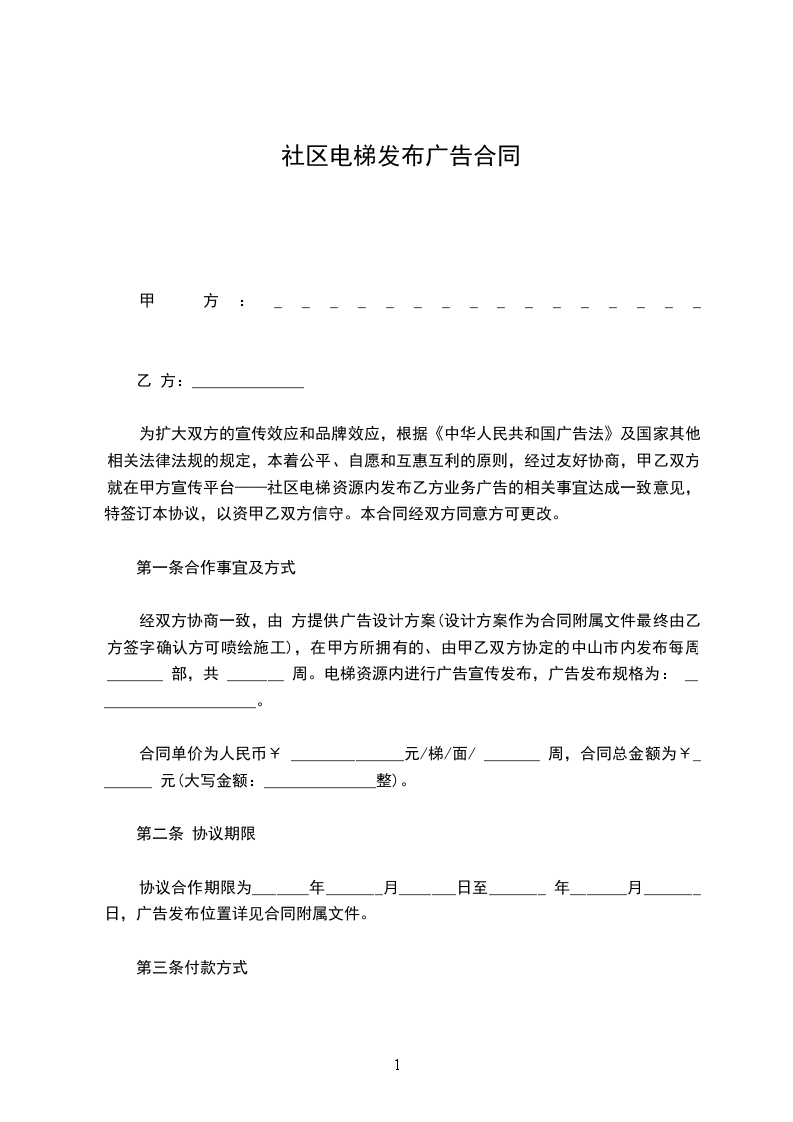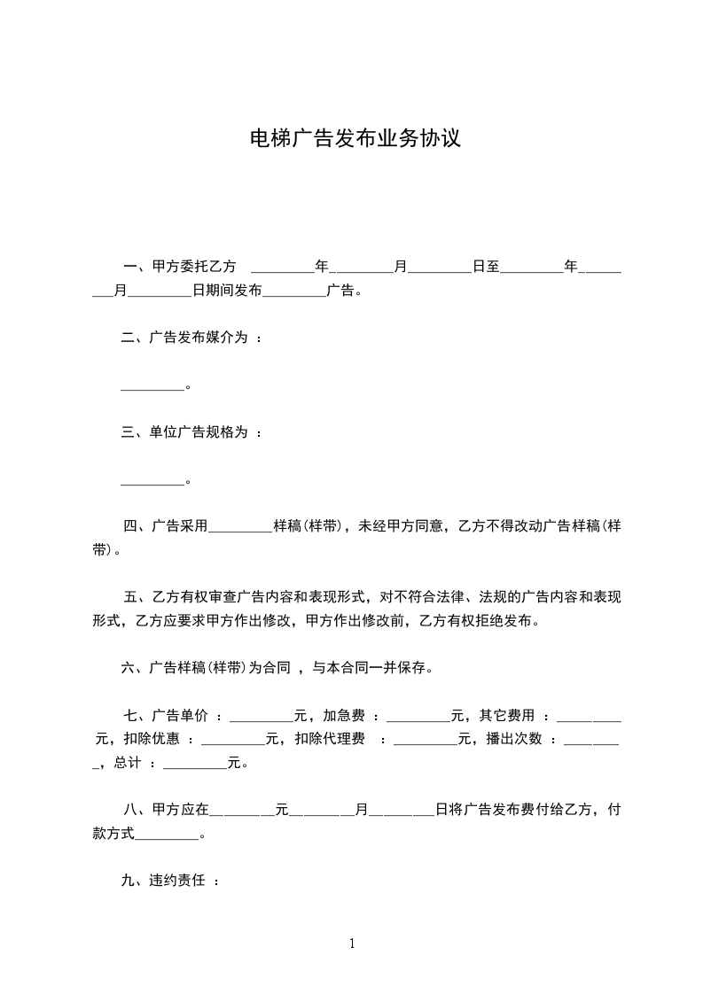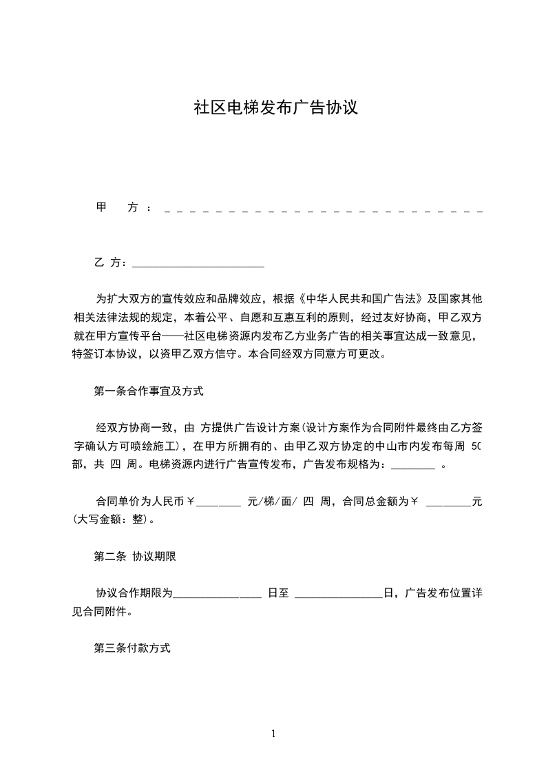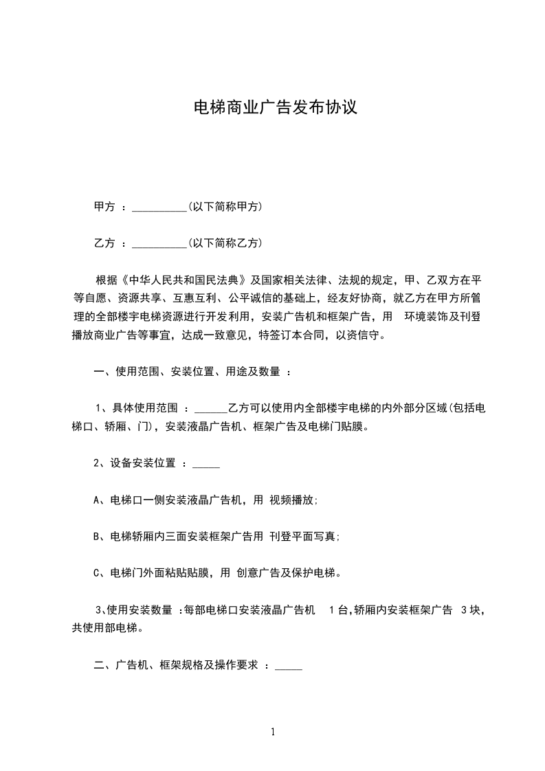 甲、乙双方就甲方服务区域内的电梯广告位代理发布事宜,经协商达成如下协议: