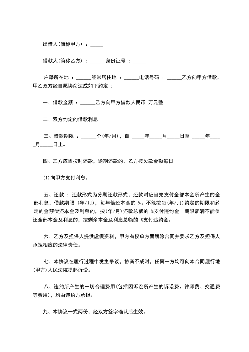 一、借款内容:乙方向甲方借款人民币 元(¥ 元),借款期限为 ,自_________年____月____日起至_________年____月____日止,借款月利率为 。乙方保证该借款用于合法途径。借款利息在借款到期日收取,乙方应在借款到期次日之前向甲方支付。借款到期,乙方应以现金(转账)方式向甲方结清借款本息。若乙方在约定借款期限内提前还款,甲方有权按合同约定的借款期限、利率收取全部借款本息。若乙方不按期偿还借款本息,甲方追讨该债权所产生的其他费用,由乙方承担。