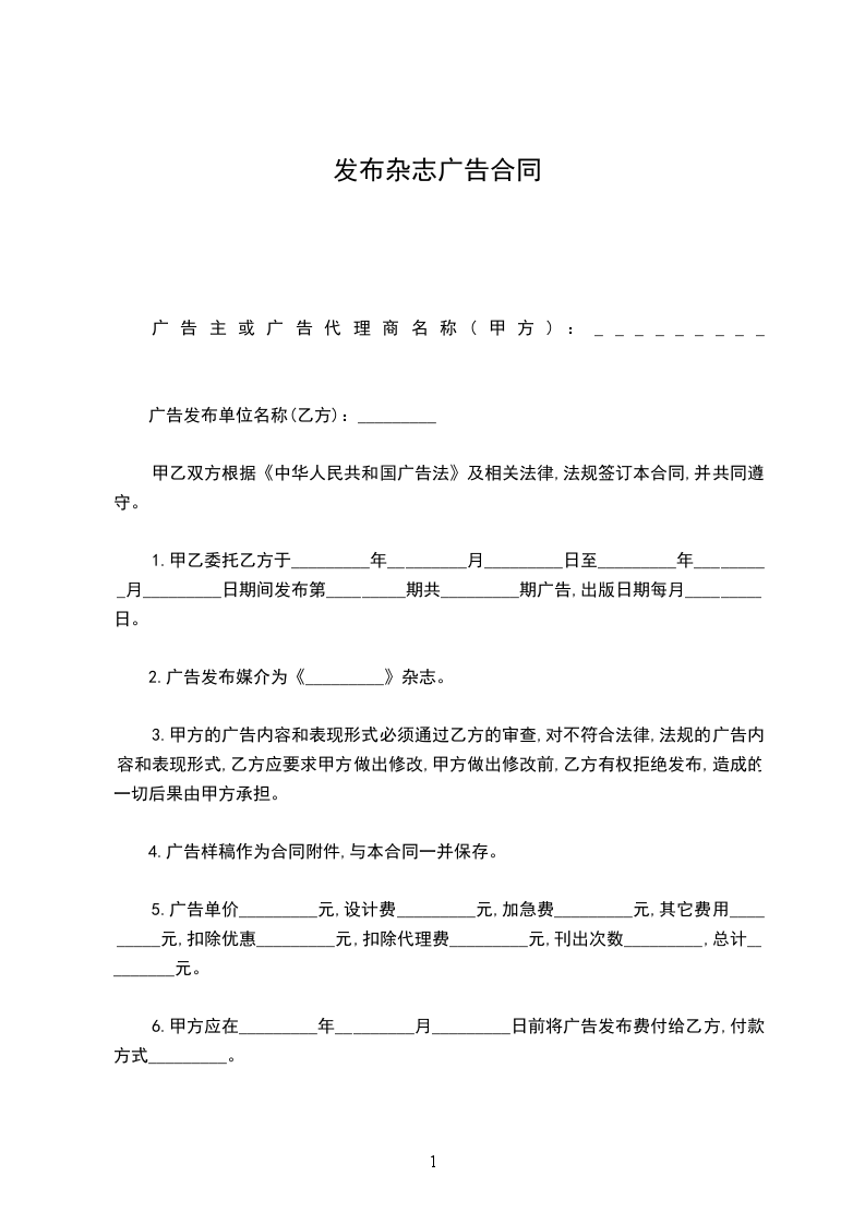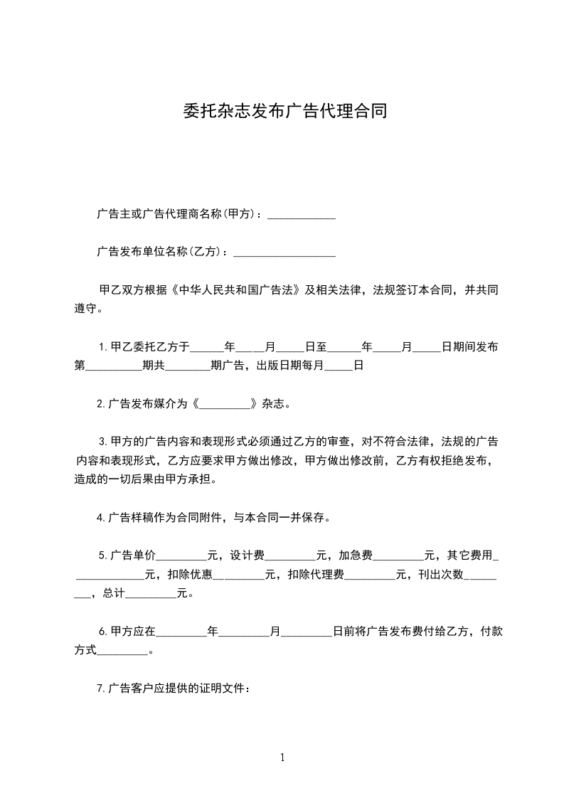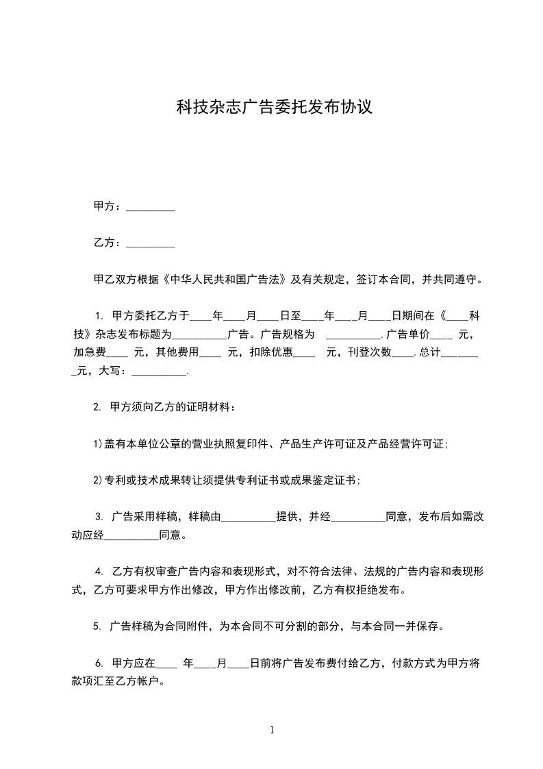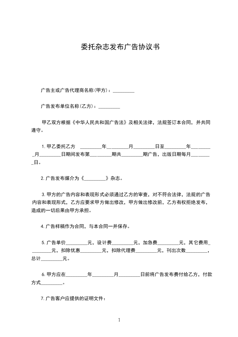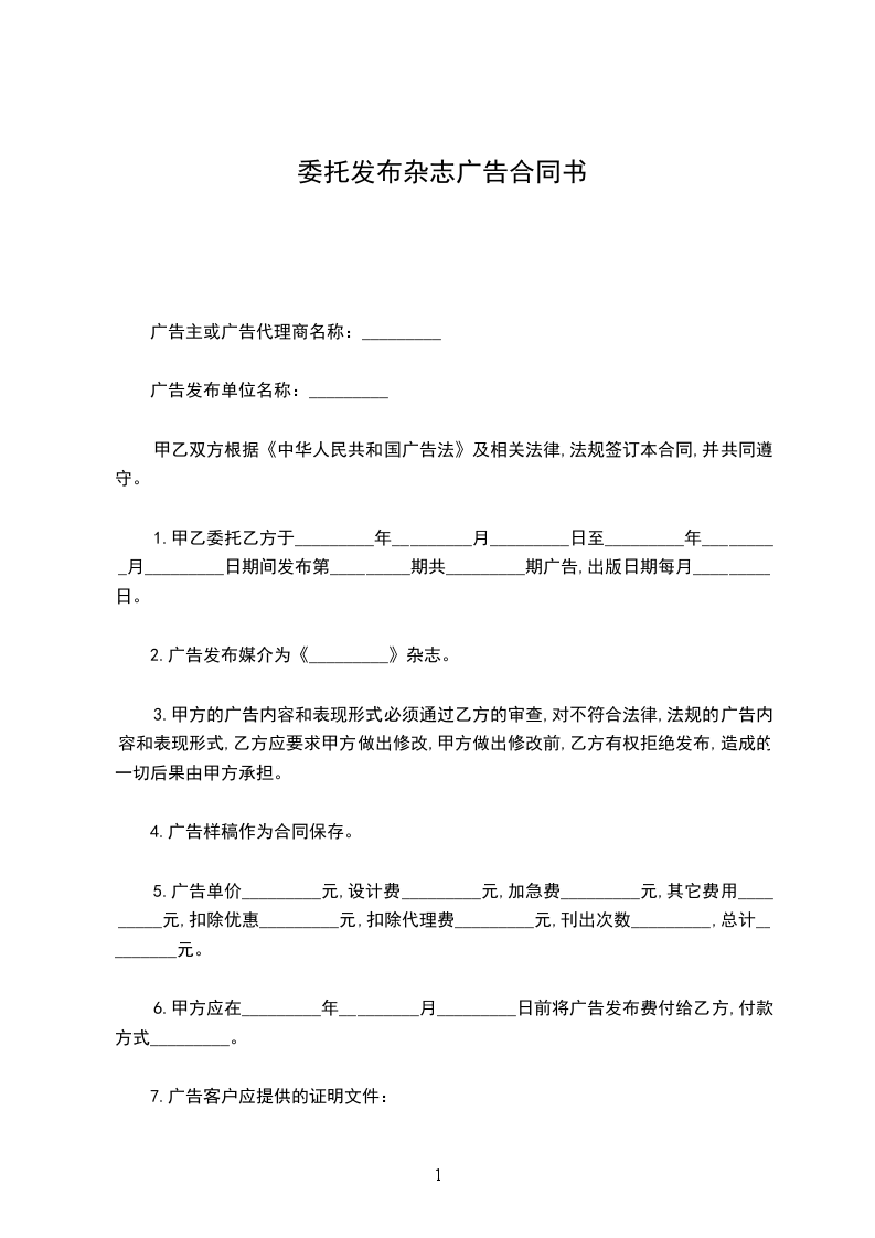 1.甲乙委托乙方于______年_____月_____日至______年_____月_____日期间发布第__________期共________期广告,出版日期每月_____日