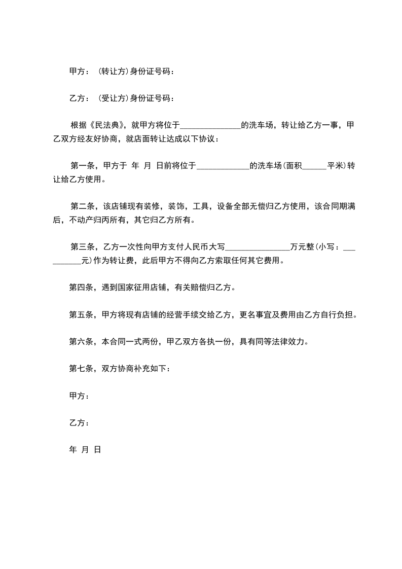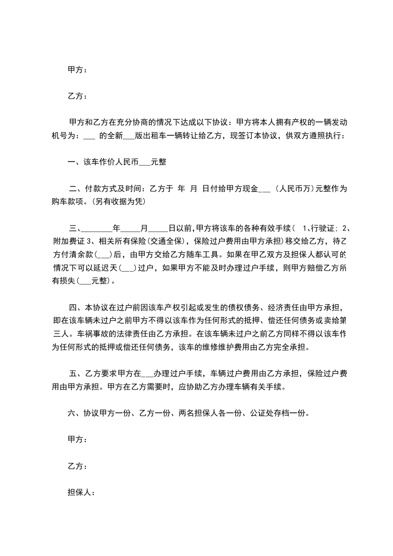 六、本协议签订后,待出租办允许办理过户手续时,甲方应无条件的积极协助乙方(乙方提前通知甲方五日内),办理车辆所有权及营运证变更手续。甲方不得刁难、搪塞,故意制造借口不予配合;不得以此为借口再次向乙方索要任何费用,如因甲方主观故意不予配合致使乙方不能及时办理过户手续时,每拖延一天,甲方承担¥元的滞纳金,并承担由此引起的所有损失。如因乙方因素导致无法正常过户时,概由乙方负责。过户时所需费用全部由乙方承担。七、在本协议签订后,在过户手续未办理完毕时,甲方应允许乙方可再次转卖,乙方须提前通知甲方,再办理过户手续时,甲方应予以积极配合。甲方不得刁难、搪塞,故意制造借口不予配合;不得以此为借口再次向乙方索要任何费用,如因甲方主观故意不予配合致使乙方不能及时办理过户手续时,每拖延一天,甲方承担¥元的滞纳金,并承担由此引起的所有损失。八、签约地点:九、如有附加条款,双方协商添加,视同具有同等法律效力。