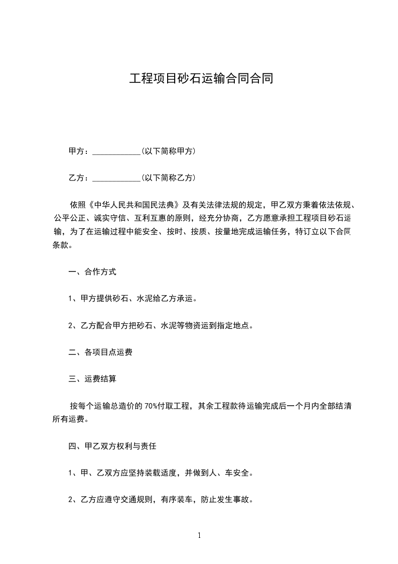 依照《中华人民共和国民法典》及有关法律法规的规定,甲乙双方秉着依法依规、公平公正、诚实守信、互利互惠的原则,经充分协商,乙方愿意承担工程项目砂石运输,为了在运输过程中能安全、按时、按质、按量地完成运输任务,特订立以下合同条款。