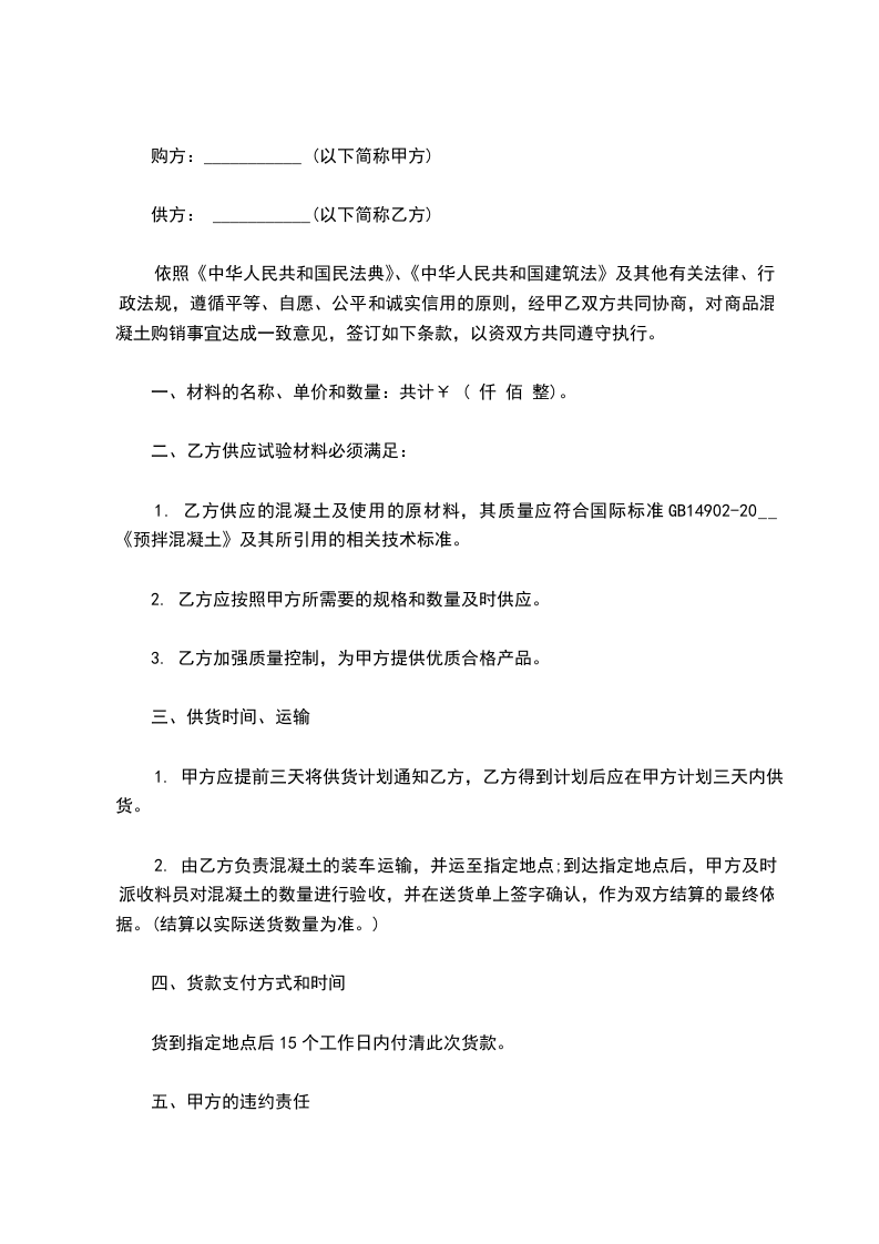 1. 乙方供应的混凝土及使用的原材料,其质量应符合国际标准GB14902-20__《预拌混凝土》及其所引用的相关技术标准。
