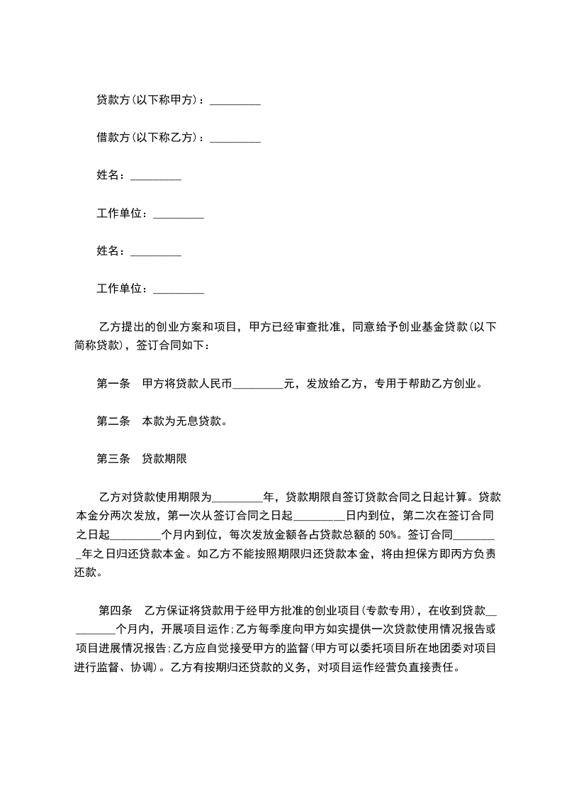 第一条 甲方将贷款人民币_________元,发放给乙方,专用于帮助乙方创业。