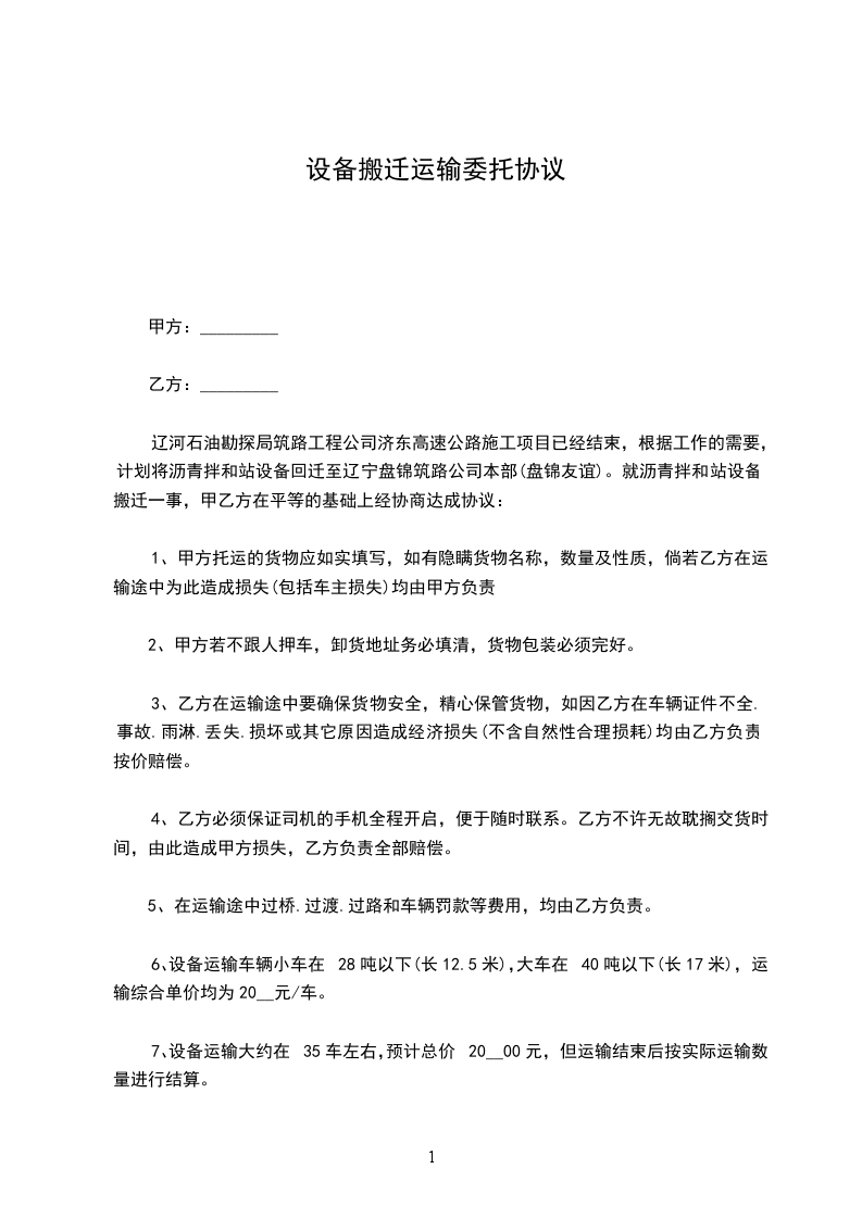辽河石油勘探局筑路工程公司济东高速公路施工项目已经结束,根据工作的需要,计划将沥青拌和站设备回迁至辽宁盘锦筑路公司本部(盘锦友谊)。就沥青拌和站设备搬迁一事,甲乙方在平等的基础上经协商达成协议: