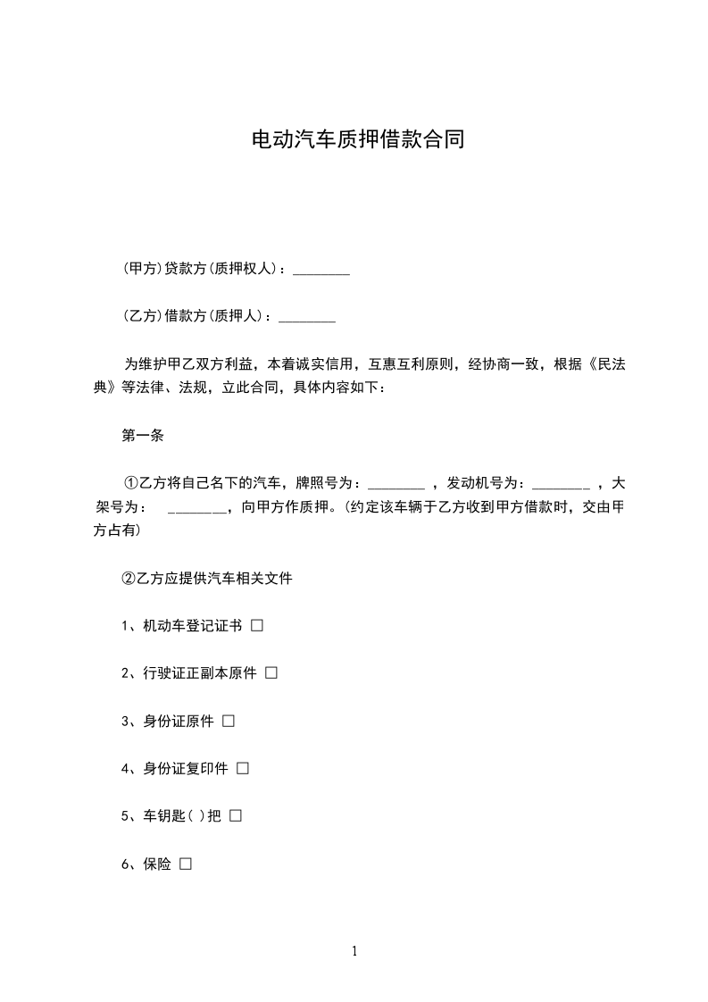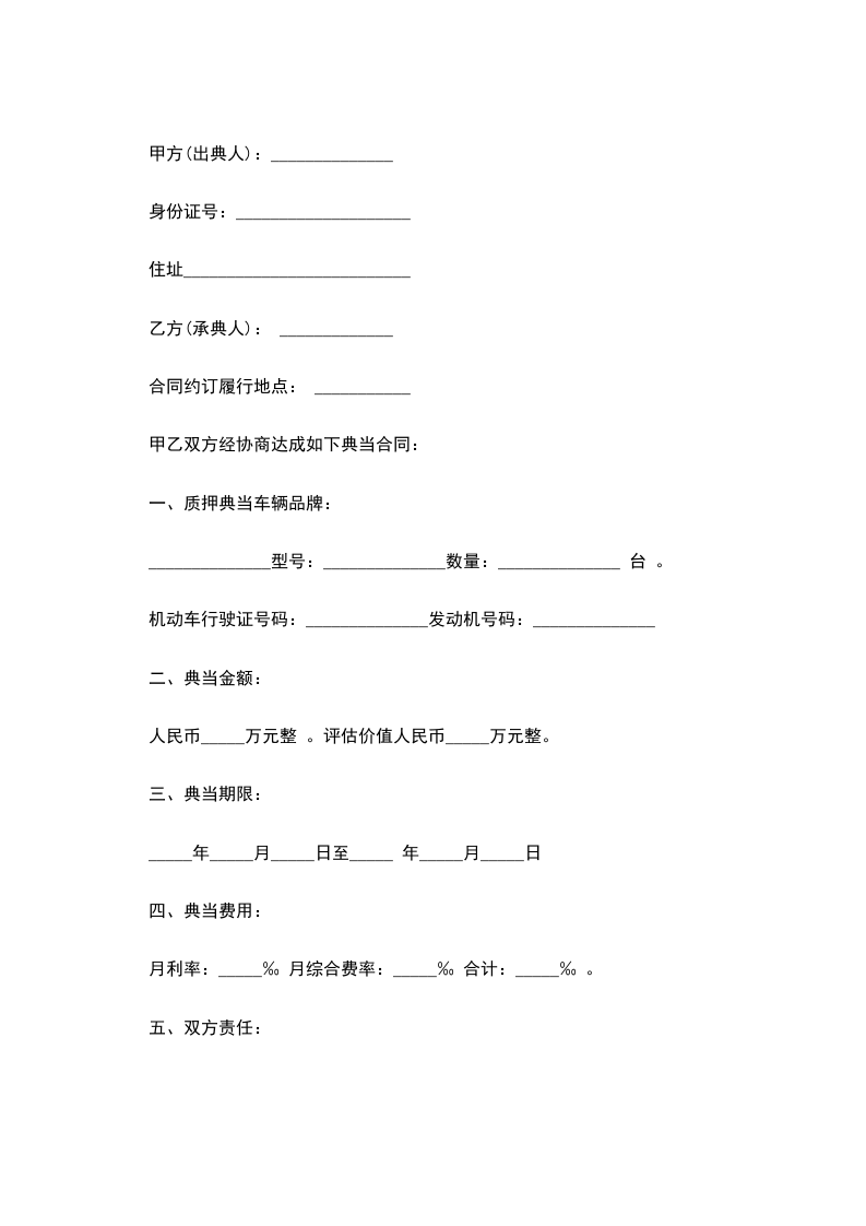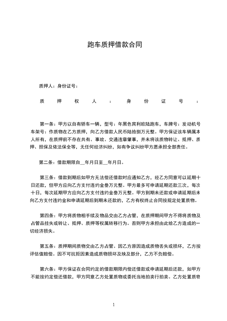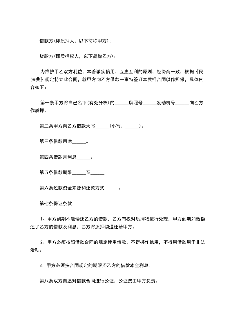2、甲方自愿以车主:______________ 车牌号为:_________________ 无抵押登记的机动车做质押,并且同意将车主身份证原件,行驶证,机动车登记薄等一并质押。逾期不还款,乙方有权变卖质押车辆实现债权,多退少补。