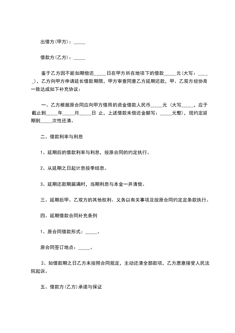 一、乙方根据原合同应向甲方借用的资金借款人民币_____元 (大写_____,应于截止到_____年_____月_____日 止,上述借款未偿还金额写:_____元整),现约定延期到_____次性还清。
