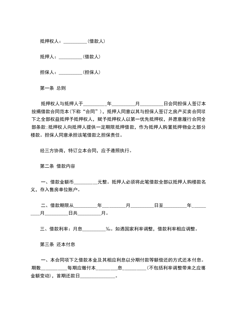 第三条 乙方在合同第一日起将抵押物权属证明交于丙方,抵押期间该权属证明(或有关部门登记的证件)由丙方代为保管。 第四条 抵押担保的范围包括借款的本金(大写) 及其利息(包括因借款人违约或逾期还款所计收的复息和加收的利息)、借款人违约金和实现抵押权的费用。