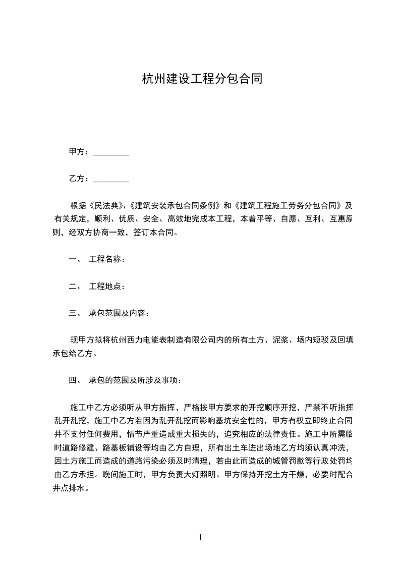 根据《民法典》、《建筑安装承包合同条例》和《建筑工程施工劳务分包合同》及有关规定,顺利、优质、安全、高效地完成本工程,本着平等、自愿、互利、互惠原则,经双方协商一致,签订本合同。