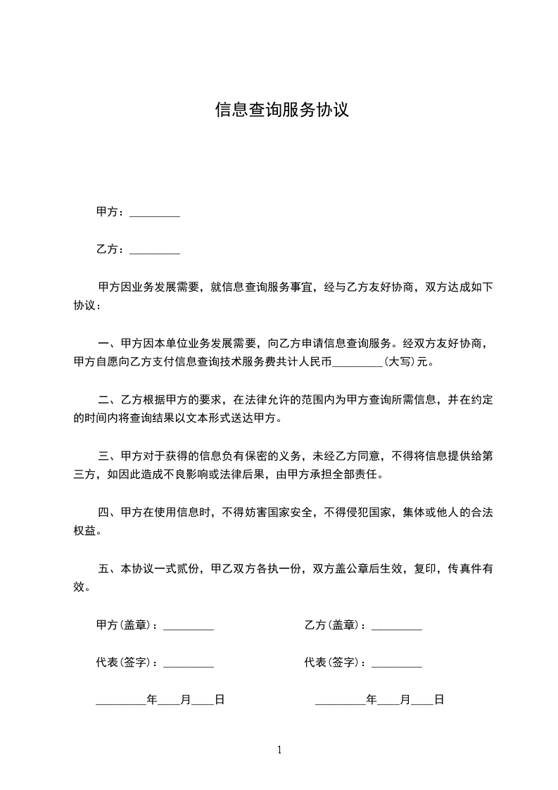 一、甲方因本单位业务发展需要,向乙方申请信息查询服务。经双方友好协商,甲方自愿向乙方支付信息查询技术服务费共计人民币_________(大写)元。