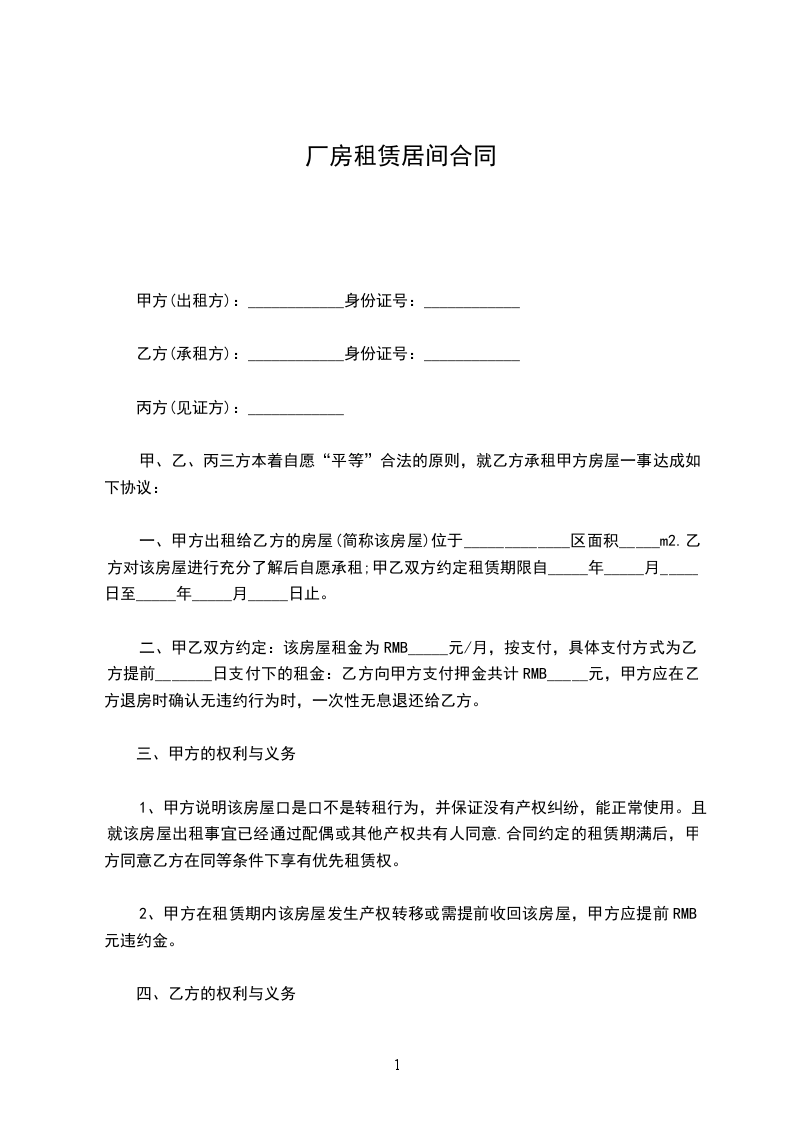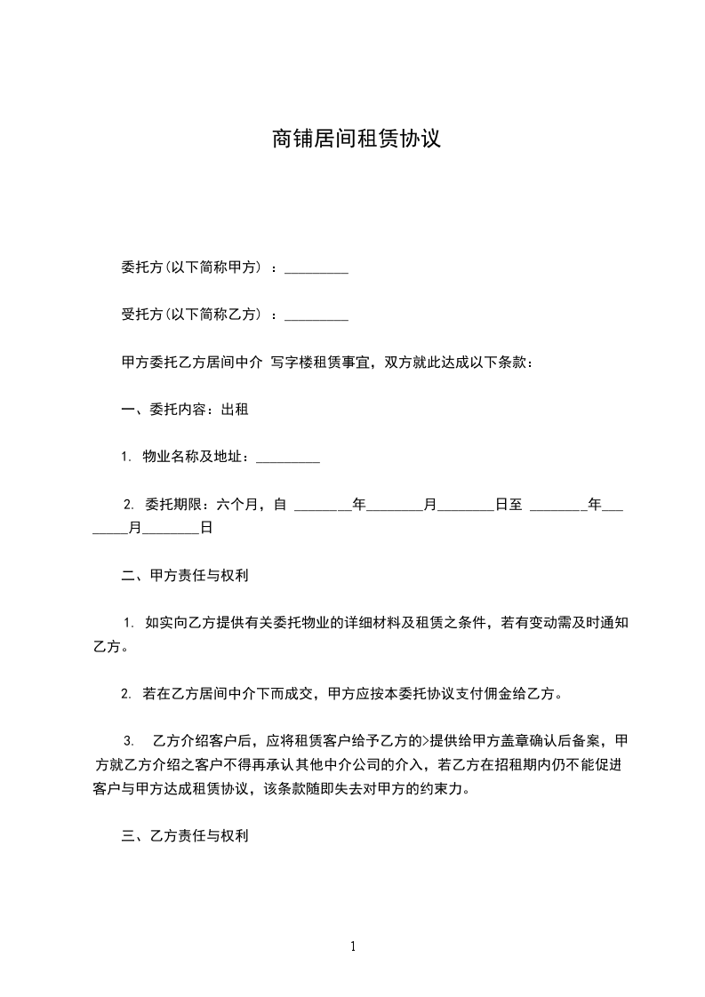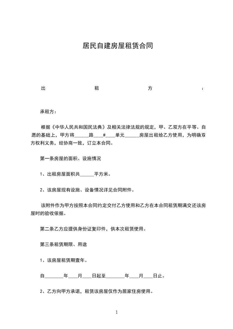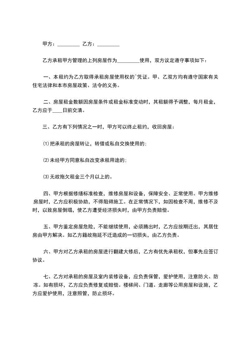 1.甲方自愿将其合法拥有的座落于__________的房屋出租给乙方使用。该房屋建筑面积共__________,房产性质__________,证号为__________。