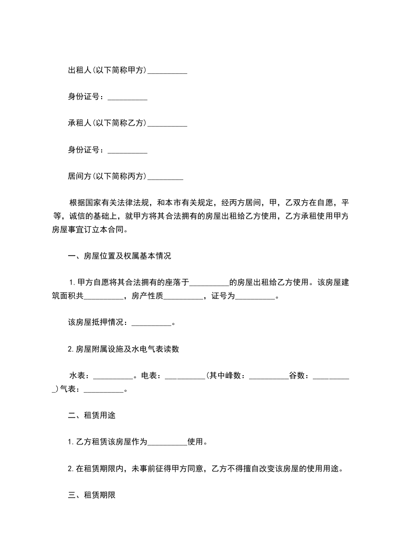根据国家有关法律法规,和本市有关规定,经丙方居间,甲,乙双方在自愿,平等,诚信的基础上,就甲方将其合法拥有的房屋出租给乙方使用,乙方承租使用甲方房屋事宜订立本合同。